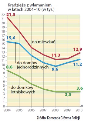Według policyjnej statystyki, liczba włamań do mieszkań wyraźnie w ostatnich latach spadła (patrz ramka). Wprawdzie nie każdy zgłasza, że został okradziony – wiara w skuteczność policji jest umiarkowana – ale spadek wydaje się pewny. Bardzo zmniejszyła się także liczba włamań do domków letniskowych, okradanych przez złodziei z najniższej półki. Czasem nie trzeba ich nawet szukać: 19-latek z Lubina zgubił koło okradzionego domku reklamówkę, w której był jego dowód. W Świdnicy menel włamał się do altany w ogrodzie działkowym, zamieszkał w niej i okradał domek za domkiem. Głównie ze wszystkiego, co nadawało się na złom, ale także z narzędzi ogrodniczych, kosiarek. Wpadł dopiero przy 11 domku. W miejscowościach letniskowych i ogrodach działkowych złodziejski sezon zaczyna się późną jesienią, a kończy w marcu. Zmienia się też trochę profil złodziejskich zainteresowań. Kiedyś z letnich domków wyciągano przede wszystkim narzędzia czy materiały budowlane i ich wyposażenie. Dzisiaj, m.in. na Mazowszu, grasują gangi, które z dacz, jeśli nie ma ochrony i alarmów, wykręcają w budynkach wszystkie krany i inną armaturę.