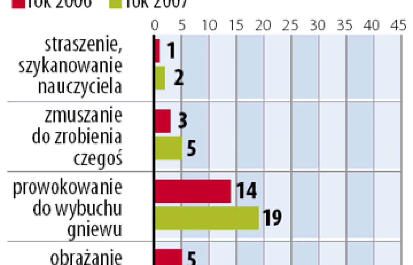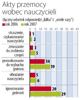 Głównie agresja pomiędzy uczniami a nauczycielami. Tu w ciągu ostatniego roku mamy radykalny przyrost. Z 14 do 19 proc. wzrosła grupa nauczycieli przyznających, że byli przez uczniów prowokowani do wybuchu gniewu. A procent nauczycieli przyznających, że uczniowie ignorują ich polecenia, wzrósł z 20 do 29. Rok temu 3 proc. nauczycieli twierdziło, że uczniowie zmuszają ich do zrobienia czegoś, na co nie mają ochoty.