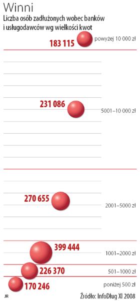 Polski dłużnik rekordzista mieszka w stolicy. Jest winien bankom łącznie 73,1 mln zł. Jak głosi plotka, pożyczył te pieniądze na inwestycje w akcje. Niestety, z powodu trwającego od sierpnia 2007 r. załamania na giełdach widoki na olbrzymie zyski prysły, zaś do spłacenia pozostał trudny do wyobrażenia dług. W kategorii ilościowej zwycięża zaś pewien mieszkaniec województwa śląskiego, który zalega z 46 różnymi płatnościami na łączną kwotę 1,25 mln zł. Wśród zobowiązań, których nie reguluje, są m.in. kredyty bankowe, pożyczki gotówkowe na telefon, nieopłacone polisy, czynsz za mieszkanie w spółdzielni, rachunki za telefon i prąd.