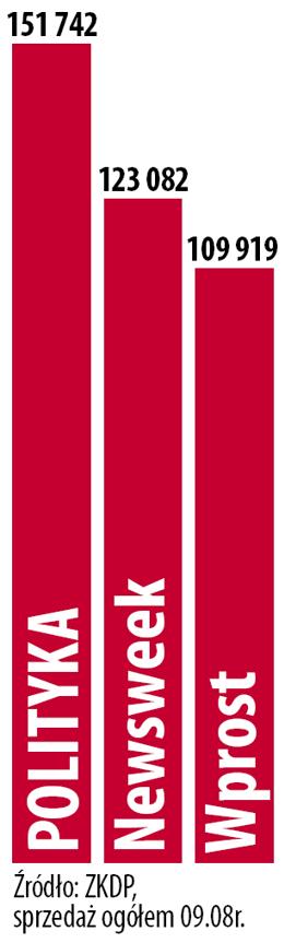 Średnia sprzedaż ogółem „Polityki” we wrześniu wyniosła 151 742 egz. i była o ok. 28 000 egz. wyższa niż sprzedaż „Newsweeka” (123 082 egz.) oraz o ok. 41 000 egz. wyższa niż sprzedaż „Wprost” (109 919 egz.).