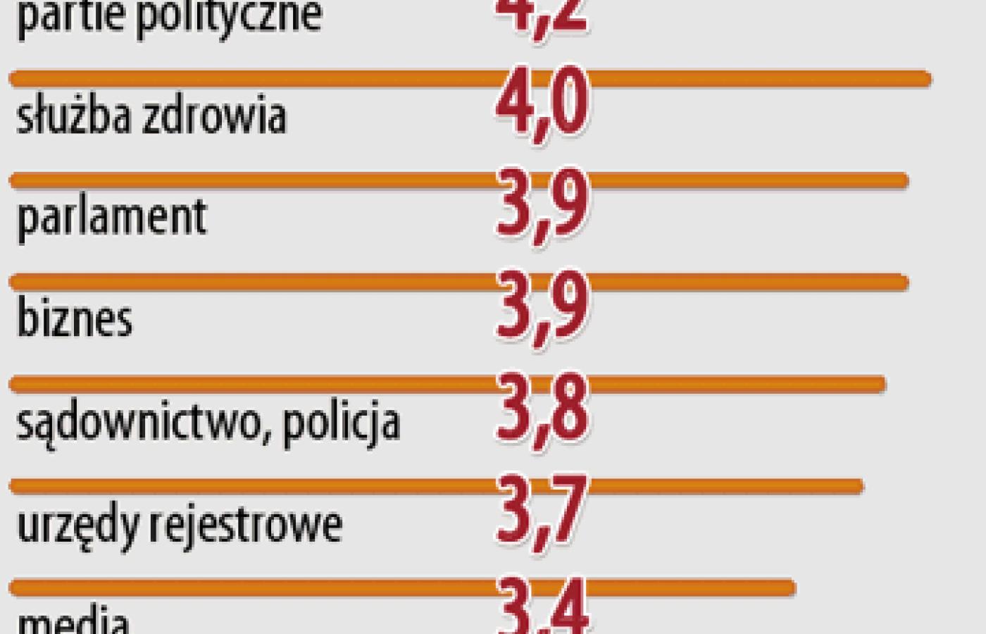 W skali od 1 do 5 (im więcej, tym wyższy stopień skorumpowania) my, Polacy, oceniamy polityków na 4,2, identycznie jak Włosi (przy średniej unijnej 3,7). Od tej średniej odstajemy też w innych miejscach: w całej Unii drugie miejsce pod względem stopnia skorumpowania zajmuje biznes (3,4), u nas – służba zdrowia (4), chociaż o biznesie mamy niewiele lepsze zdanie (3,9). Jako bardzo sprzedajny postrzegamy też parlament (3,9, w całej Unii – 3,2) oraz sądownictwo (w Polsce 3,8, w Unii tylko 2,9).