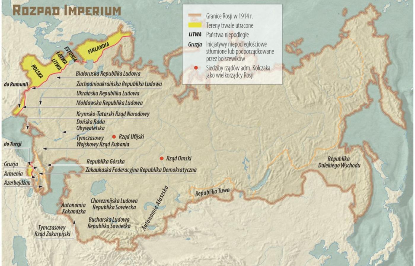 Wojna i rewolucja lutowa 1917 r., a następnie przewrót bolszewicki oraz będące jego następstwem wojna domowa i interwencja wojsk Ententy doprowadziły do wielu zmian terytorialnych na obszarach byłego Imperium Romanowych. Proces ten miał przynajmniej dwie fazy: czas utraty części podbitych przez wieki terytoriów, a następnie czas ich odzyskiwania. Po okresie burzliwych ruchów autonomicznych i narodowowyzwoleńczych, datowanym mniej więcej do przełomu 1920/1921 r., bolszewicy podjęli wysiłek na rzecz odwojowywania poniesionych strat. Proces rewindykowania tzw. okrain zakończył się – jak triumfalnie ogłosili – 15 listopada 1922 r. wraz z inkorporacją Republiki Dalekiego Wschodu. Jak wiemy, polityka rozbudowy Imperium, tym razem czerwonego, nie została jednak wówczas zakończona. Po latach miała swe kolejne odsłony: 1939–1941 r. (ponad połowa Drugiej Rzeczpospolitej, Karelia, Besarabia, Północna Bukowina, Litwa, Łotwa i Estonia) oraz 1944–1945 r. (Okręg Królewiecki, Ruś Podkarpacka, Kuryle, Południowy Sachalin).