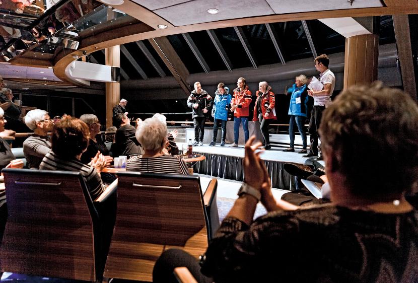 – Współpracujemy z lokalnymi przedsiębiorcami na lądzie, którzy mogą podzielić się swoją wiedzą i doświadczeniem – wyjaśnia Hans, kierownik wyprawy, na stanowisku od 12 lat. Na przykład w Kjøllefjordzie miejscowy poławiacz krabów królewskich Kjell pokazuje na górnym pokładzie, jak taki krab wygląda i daje spróbować najcenniejszego mięsa w tej szerokości geograficznej. – Poza tym chcemy ludziom pokazać jak najwięcej, opowiedzieć o historii miejsc, które odwiedzają – dodaje.