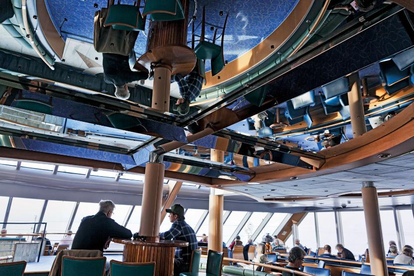 Mówi się, że od samego wejścia na pokład hurtigruty człowiek robi się 20 lat starszy, bo w nowoczesnym świecie głównie emeryci mają czas na tak długie podróże. Od samego rana cierpiący na bezsenność snują się po pokładach, wyspani czytają opasłe powieści, robią na drutach, robią zdjęcia telefonami przez szybę albo smakują lokalne wiktuały serwowane przez restaurację. Jedni wybierają ręcznie obierane krewetki, inni hodowlanego łososia albo deser z malin moroszek. W czasach, kiedy Północ odkrywana jest przez turystów, którzy byli już wszędzie, rzadko słyszy się tu norweski. Norwegów najłatwiej spotkać w kawiarni na czwartym pokładzie, gdzie przesiadują przy czarnej kawie i waflach z brązowym serem.