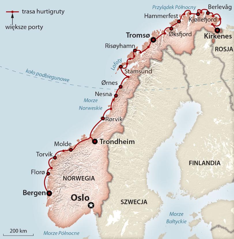 Od końca XIX w. wszystko, co potrzebne do życia wzdłuż północnego wybrzeża Norwegii, transportowano i nadal transportuje się na pokładach linii promowej Hurtigruten, którą nazywa się tutaj po prostu hurtigrutą. Przewożono pocztę, ryby, materiały budowlane i ludzi. Teraz głównie przewozi się tych ostatnich. Hurtig to znaczy szybko, jednak północne szybko oznacza coś innego niż środkowoeuropejskie. O wszystkim decyduje tutaj pogoda, więc nikt się nie spieszy. Najważniejsze, żeby dotrzeć do celu.