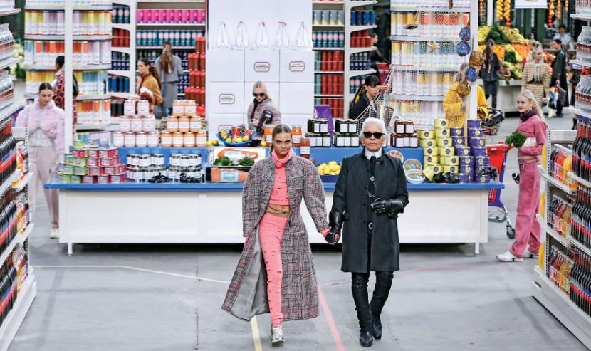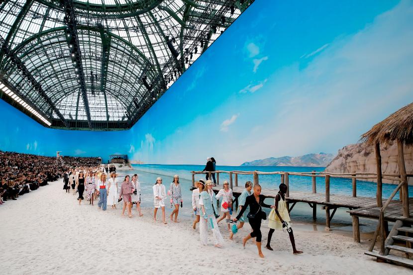 Brzmi jak banał, ale pokazy Chanel, marki, którą Lagerfeld kierował ponad trzy dekady, rzeczywiście były najbardziej wyczekiwanym wydarzeniem paryskich fashion weeków. Przyćmiewały konkurencję skalą, budżetem i scenografią. Nie że szczególnie oryginalną, przeciwnie: wręcz banalną. Zrealizowaną jednak z niespotykanym rozmachem. Wnętrza swojego ulubionego Grand Palais Karl potrafił zamienić we francuski ogród z romantycznymi alejkami wokół fontann czy w stację kosmiczną ze startującą rakietą. Bywało, że budował lotniczy terminal albo inscenizował galerię sztuki współczesnej. Te swoiste imprezy tematyczne dopracowywał w najdrobniejszych szczegółach. Jeśli odtwarzał supermarket, modelki szły między regałami z tysiącem wyprodukowanych na potrzeby pokazu dóbr, sygnowanych logo marki. Były zatem zgrzewki wody mineralnej Chanel, półki majonezu Chanel, jajka ze stemplem Chanel, pieczywo tostowe, proszki, miotły – wszystko, co znaleźlibyśmy w typowym sklepie. Tyle że nie na sprzedaż, z wyjątkiem biżuteryjnych modeli klasycznych metalowych koszyków, jakie pamiętamy z dawnych samów. Ostatni pokaz pret-à-porter z kolei scenografią przeniósł gości nad morze. Oglądali go ze stopami w piasku; były prawdziwe fale i plaża, molo, drewniany pomost, budka ratowników i drgające na wietrze grzywy traw.