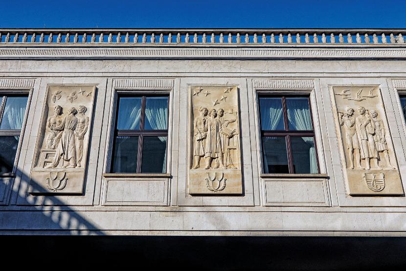 Stałość detalu wychodzi tu czasem na dobre. Jakimś cudem i wojnę, i PRL przetrzymał fryz na zewnętrznej ścianie Sali Posiedzeń. Utrzymany w poetyce mieszanki art déco i stylu zakopiańskiego składa się z 18 kompozycji, to m.in. walka lewicy z prawicą, lotnictwo, orka, marynarka, handel, rzemiosło, ale jest tam – i przewisiał cały PRL, przez wiele lat ukryty za wyciętym niedawno kasztanem – Piłsudski w otoczeniu legionistów. Z drugiej strony w 2016 r., przy większości sejmowej dekomunizującej co się da, na zewnętrznej ścianie korytarza marszałkowskiego zawisły kamienne płaskorzeźby przedstawiające architekturę, rzeźbę, malarstwo i muzykę. To niezrealizowany wcześniej projekt z lat 50. i najnowszy socrealizm w Warszawie.