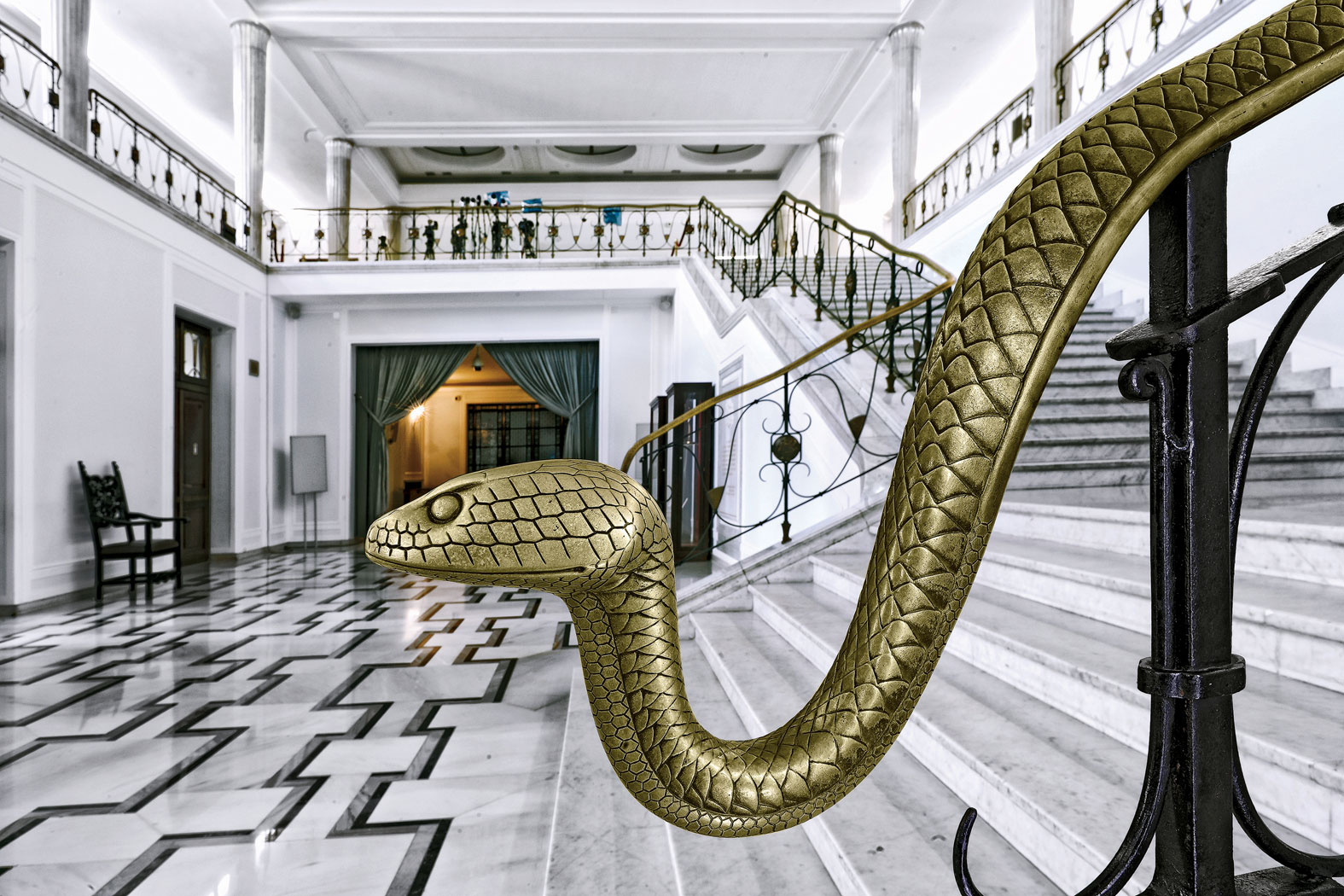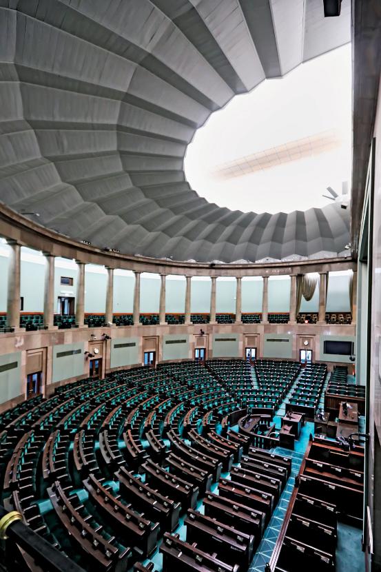 W telewizji nie widać, że dystans od drzwi frontowych do Sali Posiedzeń nie jest długi. Podobnie niespecjalnie rozległy jest główny hall, z charakterystycznymi schodami i balustradą w kształcie węży, mających symbolizować mądrość i roztropność. Właśnie wszelki detal, zwłaszcza kraty, balustrady i kamienne wykończenia, klatki schodowe oraz gra świateł, sprawia, że parlament – mimo dziwacznego, nieintuicyjnego rozkładu – prezentuje się miejscami bardzo elegancko i lekko. Choć nie wszystko się udało. Salę Kolumnową – w zamyśle Pniewskiego służącą za ciąg komunikacyjny i miejsce niezobowiązujących spotkań – zastawiono stołami z lat 90. Pniewski zakładał, że ściany będą zasłonięte kolorowymi gobelinami, miały być jeszcze trzy kolorowe plafony na suficie. Raczej się szybko nie zmaterializują, tak samo jak pewnie jeszcze przez wiele kadencji w oknach Sali Kolumnowej będą wisiały poszarzające ją upiorne firany.