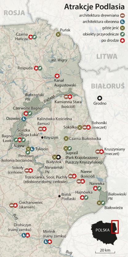 Z wakacyjnej triady wyjazdów: w góry, nad morze, nad jeziora na Podlasiu mamy tylko te ostatnie. Są piękne, jak Wigry, i tylko na leżącej w północnej części województwa Suwalszczyźnie. Tak samo rzecz ma się z zabytkami. Długo budowano niemal wyłącznie z drewna, więc bardzo starych – z oczywistych, choć przeważnie smutnych względów – przetrwało niewiele. Królewską siedzibę w Knyszynie zlokalizowano dopiero po badaniach archeologicznych. Ślad miejsca, gdzie zmarł Zygmunt August, odnalazł się pod gospodarstwami na południu miejscowości. Nie licząc kilku ceglanych kościołów, nie mają czego szukać amatorzy gotyku, praktycznie nie ma też zamków i starych miast; takiego opasanego murami nie ma ani jednego.