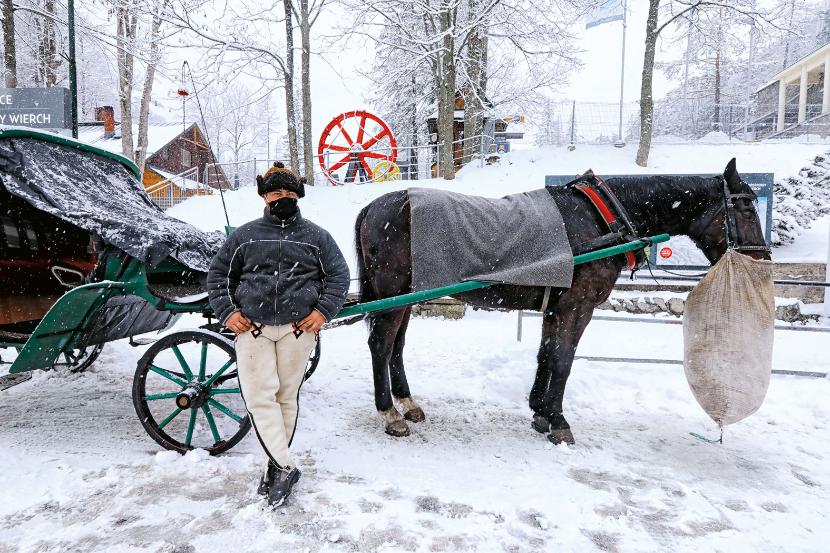 To nie jest Mirka wymarzony urlop. Żona mówiła, że szkoda na ten Zakopiec fatygi, że się wykosztują na apartament (znajomi znajomych, których widzieli pierwszy raz na oczy, wynajęli im dwa pokoje z kuchnią w jednej z prostopadłych ulic do Krupówek – za tydzień 2100 zł), a nic nie użyją, atrakcji będzie tyle, co kot napłakał. I nawet nie zjedzą jak ludzie w restauracji, tylko z dowiezionych styropianowych tacek. Letnie, rozmemłane. Snują się więc z córkami po Krupówkach. Wjechali na Gubałówkę, mają w planach jeszcze Kasprowy, ale kolej linowa raz czynna, raz nie. Jak wiatr pozwoli. Ambitniejsza górska turystyka wymaga teraz dobrego planowania, bo w schroniskach nocować nie można. Działa tam tylko gastronomia na wynos, mniej więcej do zachodu słońca. – Może jeszcze kulig. – Mirek pociąga nosem. – Coś trzeba robić.