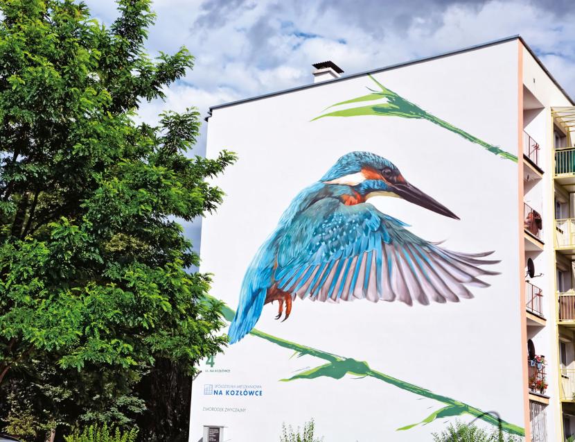 • Zatrzymujemy się w Krakowie, na osiedlu „Na Kozłówce”. Zwyczajne ściany tamtejszych bloków poddano metamorfozie i pojawiły się na nich gigantyczne ptaki. Sójka, słowik czy zięba. Wszystkie stworzenia w wersji XXL. Pomysł ptasich murali oraz przede wszystkim wykonanie – świetne. Wojciech Rokosz dał przykład, jak w pomysłowy sposób można odmienić przestrzeń publiczną, a wydźwięk ekologiczny jest tutaj chyba jasny. Z kolei na Kazimierzu przy placu Bawół czeka efektowna czarno-biała realizacja o tematyce żydowskiej duetu Broken Fingaz. Mural pamięci rodziny Bosaków pojawił się na ścianie kamienicy, która należała do rodziny. Artystyczne upamiętnienie w dobrym stylu.