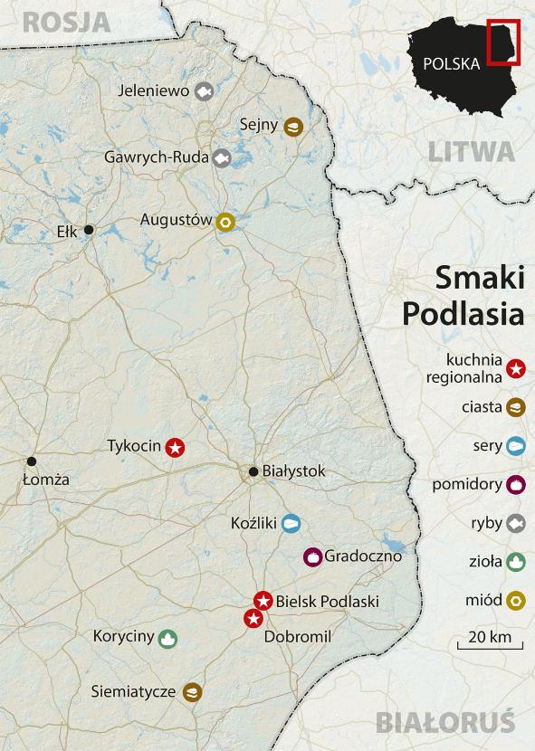 Z Koźlików ruchem konika szachowego pojechać trzeba do Tykocina. Okazuje się, że Jacek Nazarko najpierw odbudował tam własnym sumptem zamek. A od kilku lat próbuje również odbudowywać lokalne kulinaria. Serwuje tatarskie czebureki – smażone pierogi z jagnięciną i sosem jogurtowym, poleca narwiańskie gęsie pipki, czyli potrawkę z gęsich żołądków. Od jakiegoś czasu wypiekają również białysy. – Wychowałem się w Białymstoku. To smak mojego dzieciństwa. Pamiętam, że ostatnie białysy kupowało się na ulicy Młynowej. Później komuniści pozamykali prywatne piekarnie i się skończyło – mówi. A teraz się znowu zaczyna. W Tykocinie za koszyczek z trzema białysami trzeba zapłacić 10 zł. Produkują tradycyjnie z makiem i cebulą. Ale też eksperymentują, bo przecinają bułeczkę i podają ze śledziem albo np. z falafelem.