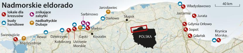 Zarówno w samorządach, jak i wśród mieszkańców wczasowisk wciąż panuje spore przyzwolenie dla inwestycji blisko plaży wymagających umocnień brzegowych. Jednak powoli coś się zmienia. Tego lata, po Międzyzdrojach wystraszonych wizją 112-metrowego wysokościowca przy plaży, zaprotestowały stanowczo malutkie Gąski (gmina Mielno). Urząd Morski w Szczecinie w trybie nagłym, bez badań i analiz, chciał je uszczęśliwić kamienną opaską brzegową o długości 2,9 km (!) za 15 mln zł. Bo inna, całkiem nieracjonalna konstrukcja ochronna w pobliskim Mielnie, nie doszła do skutku. Pozostała kasa do wydania. W trybie pilnym.