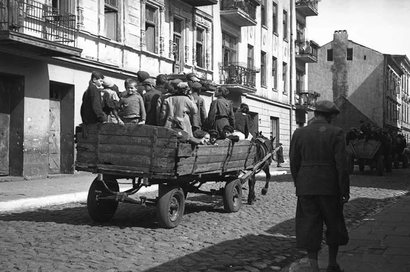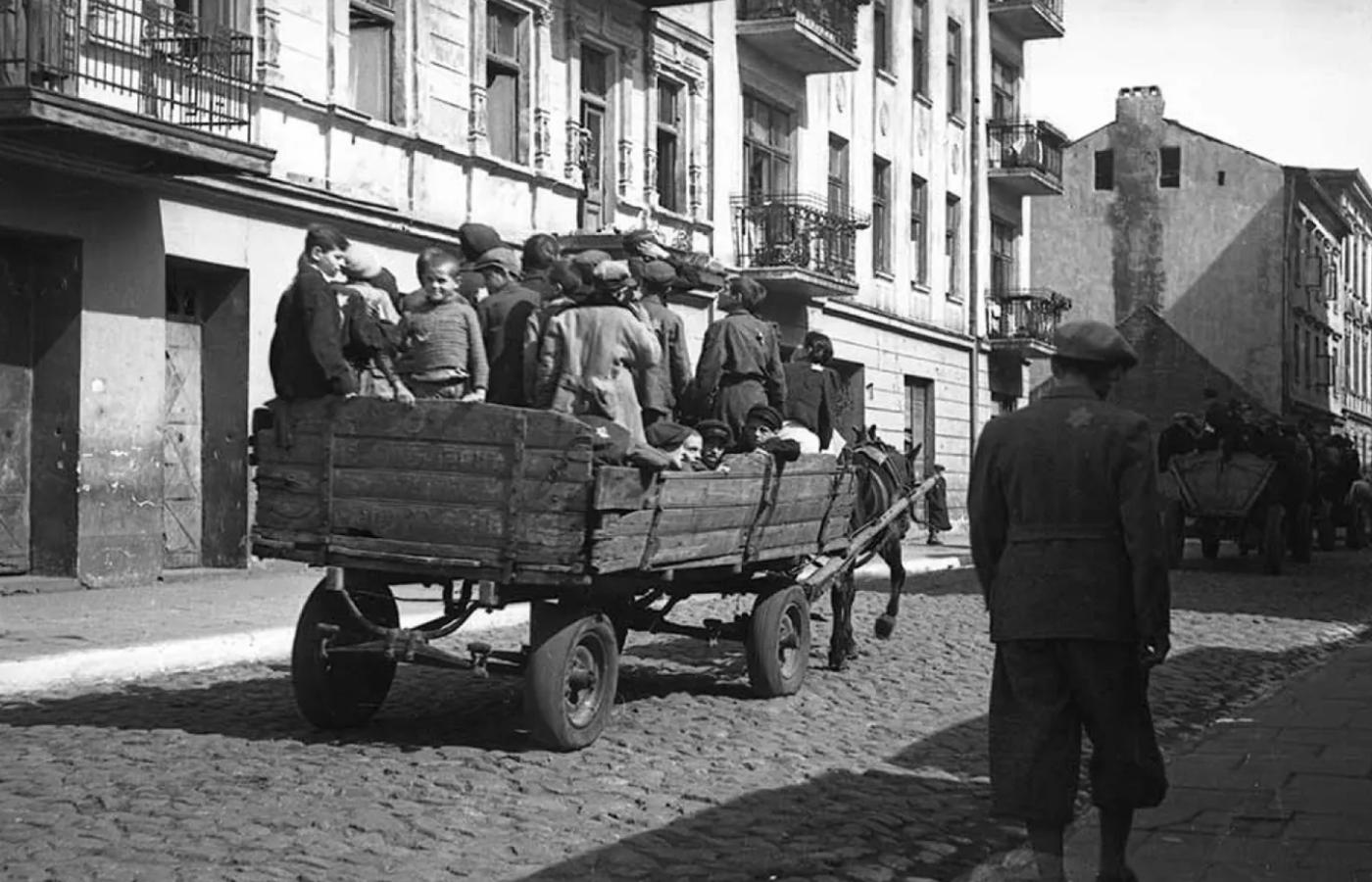 Drugą fotografię wykonał ten sam autor, Ross. Przedstawia trzy wozy konne, których pasażerami są dzieci. Ulica jest pusta, z wyjątkiem dwóch osób. Wóz na pierwszym planie jest najlepiej widoczny. Dzieci, zarówno dziewczęta, jak i chłopcy, patrzą w górę, w kierunku okien i balkonów pobliskiej kamienicy. W oknach nie widać jednak żadnych gapiów. Być może usłyszały hałas. Może ktoś je zawołał. Zdjęcie różni się od większości ujęć gettowej ulicy głównie z powodu panującej pustki. To ona buduje poczucie niepokoju.