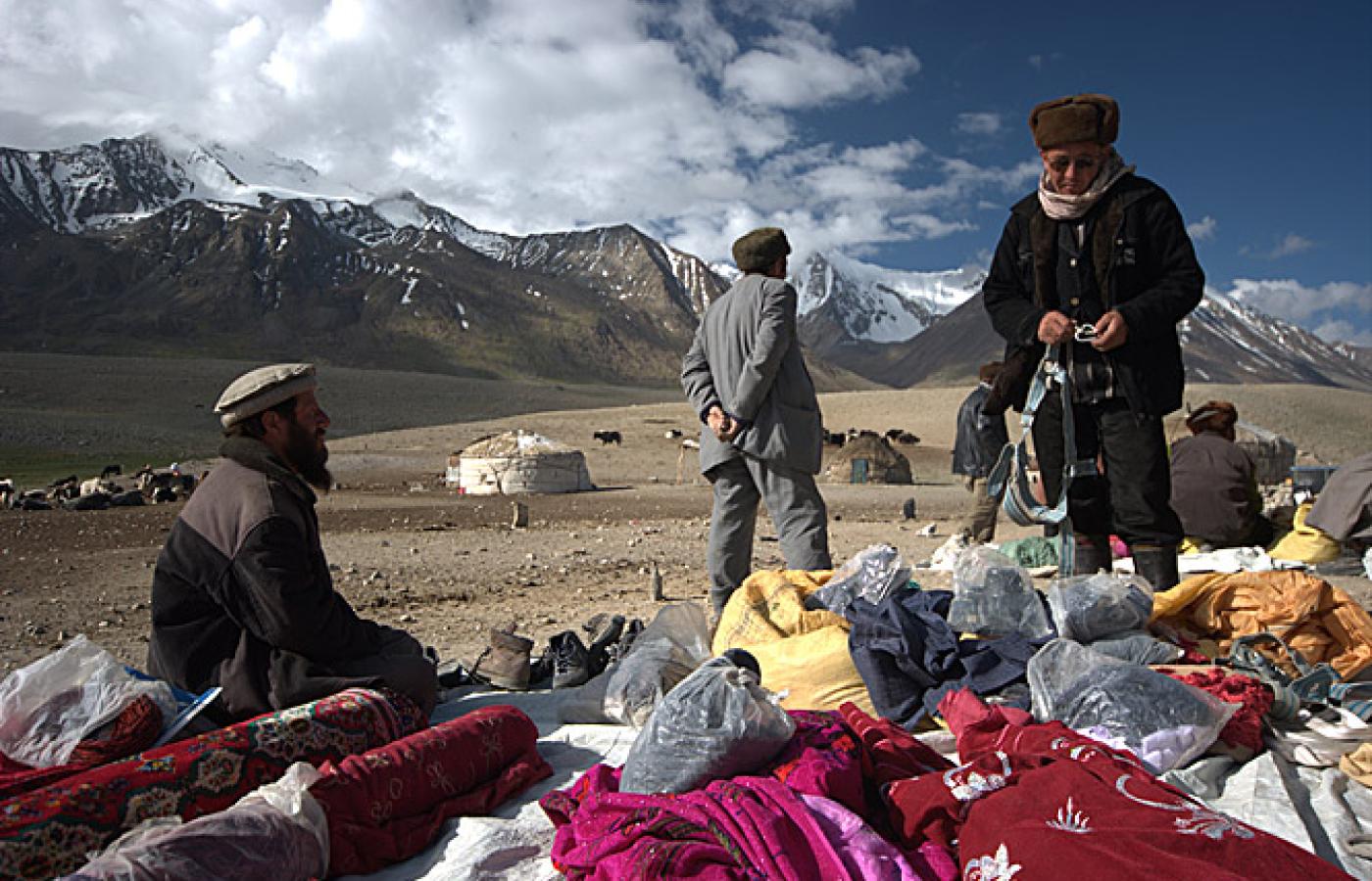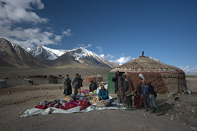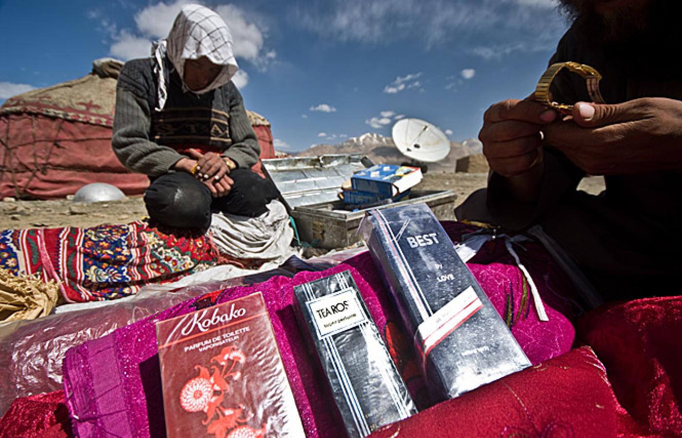 24 lutego 2010 Galerie Kirgizi w Afganistanie - galeria 24 lutego 2010 Głównymi dostarczycielami dóbr użytkowych w Małym Pamirze są wędrowni kupcy. Handlowy poranek w osadzie Irghail. Bartłomiej Tofel Bartłomiej Tofel Leżące w północno-wschodniej części Afganistanu plateau Małego Pamiru ma około 12 kilometrów szerokości i prawie 100 kilometrów długości. Osada Karakorum. Bartłomiej Tofel Znajduje się tu kilkanaście osad kirgiskich nomadów. Widok na osadę Irghail w centrum Małego Pamiru. Bartłomiej Tofel Na miarę skromnych możliwości ekonomicznych koczownicy starają się iść z duchem czasów i rozwojem technologii. Jurta w osadzie Uczdżilga. Bartłomiej Tofel Codzienne trudy spoczywają przede wszystkim na barkach kobiet. Tu kobieta z osady Irghail w drodze po wodę. Bartłomiej Tofel Powrót z wodą do jurty pełniącej rolę ogólnoobozowej kuchni. Bartłomiej Tofel Chwila przerwy w dojeniu jaków w osadzie Irghail. Bartłomiej Tofel Handlarze sprzedają głównie materiały, ubrania i buty. Pasztuński kupiec wystawia swoje towary w osadzie Irghail. Bartłomiej Tofel Ważną część asortymentu stanowią także towary luksusowe - perfumy, pozłacane zegarki i inne ozdoby. Handel w osadzie Uczdżilga w Małym Pamirze. Bartłomiej Tofel Wędrowni handlarze pochodzą najczęściej z Badachszanu lub okolic Kabulu. Tu pasztuńscy kupcy z oazy Parwan pod Kabulem. Bartłomiej Tofel Istotną rolę w życiu nomadów pełni gościnność. Tradycja każe witać każdego przybysza posiłkiem. Na zdjęciu jurta w osadzie Sayotuk. Bartłomiej Tofel Brak dostępu do nowoczesnej opieki zdrowotnej i trudne warunki życia to niektóre z przyczyn popularności opium. Samad podczas jednej z codziennych sesji. Więcej na ten tematKirgizi na pustkowiach Azji