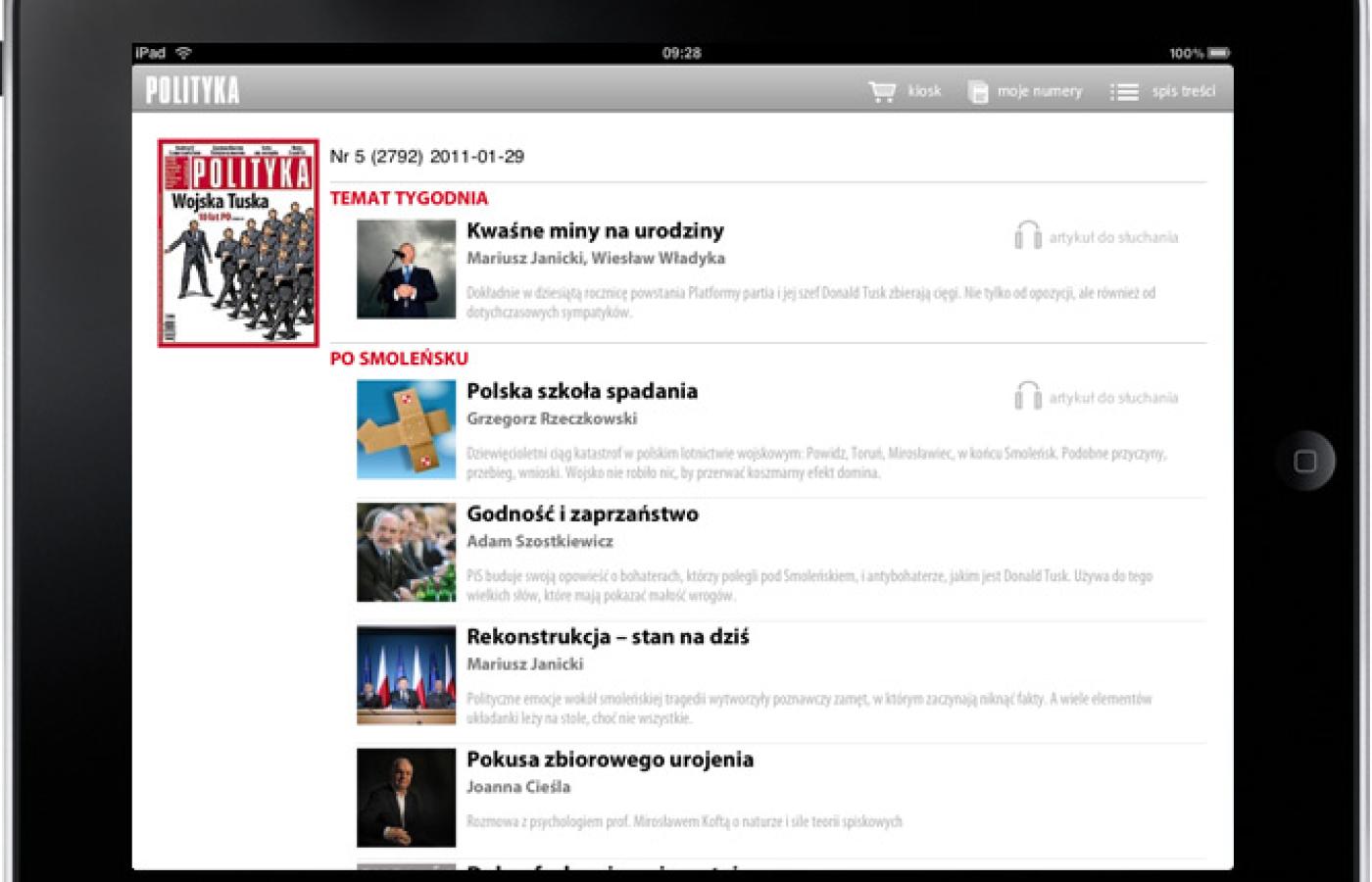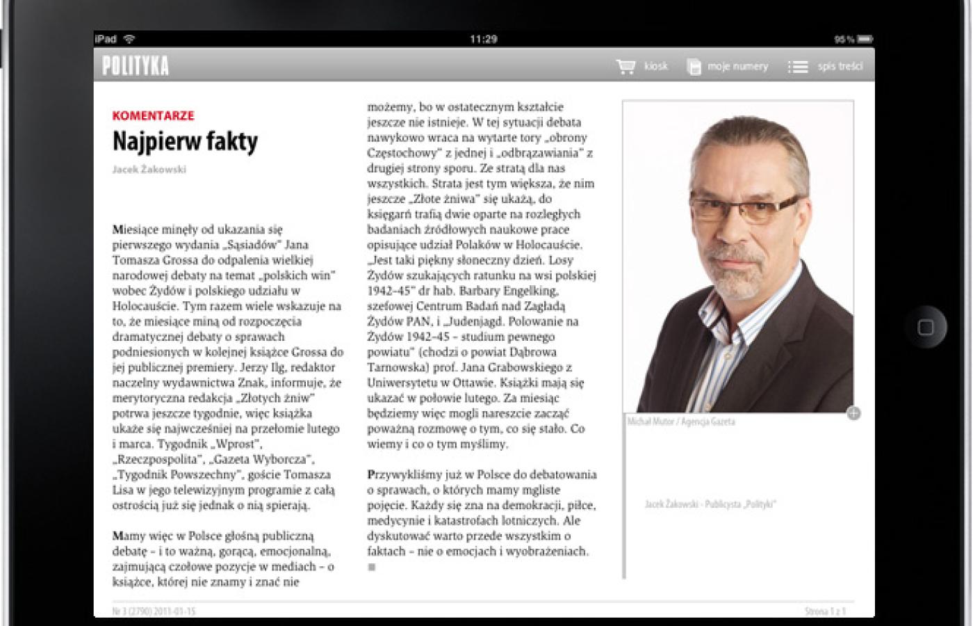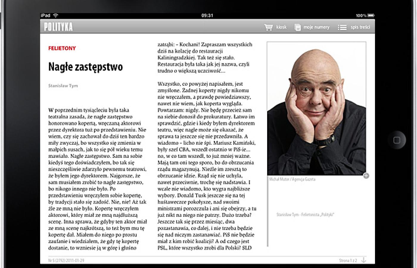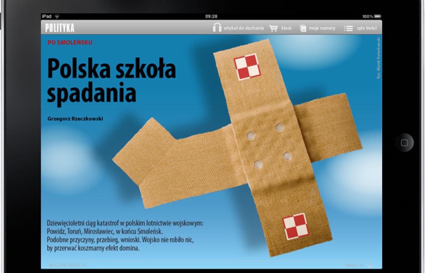Z prawdziwą satysfakcją przedstawiamy wydanie POLITYKI na iPada. Dołożyliśmy starań, by nasza aplikacja była prosta w użyciu i funkcjonalna. Wiemy, że nasi Czytelnicy nade wszystko cenią sobie dobry tekst. Mamy jednak nadzieję, że także w szacie graficznej na tablecie odnajdą ducha POLITYKI.