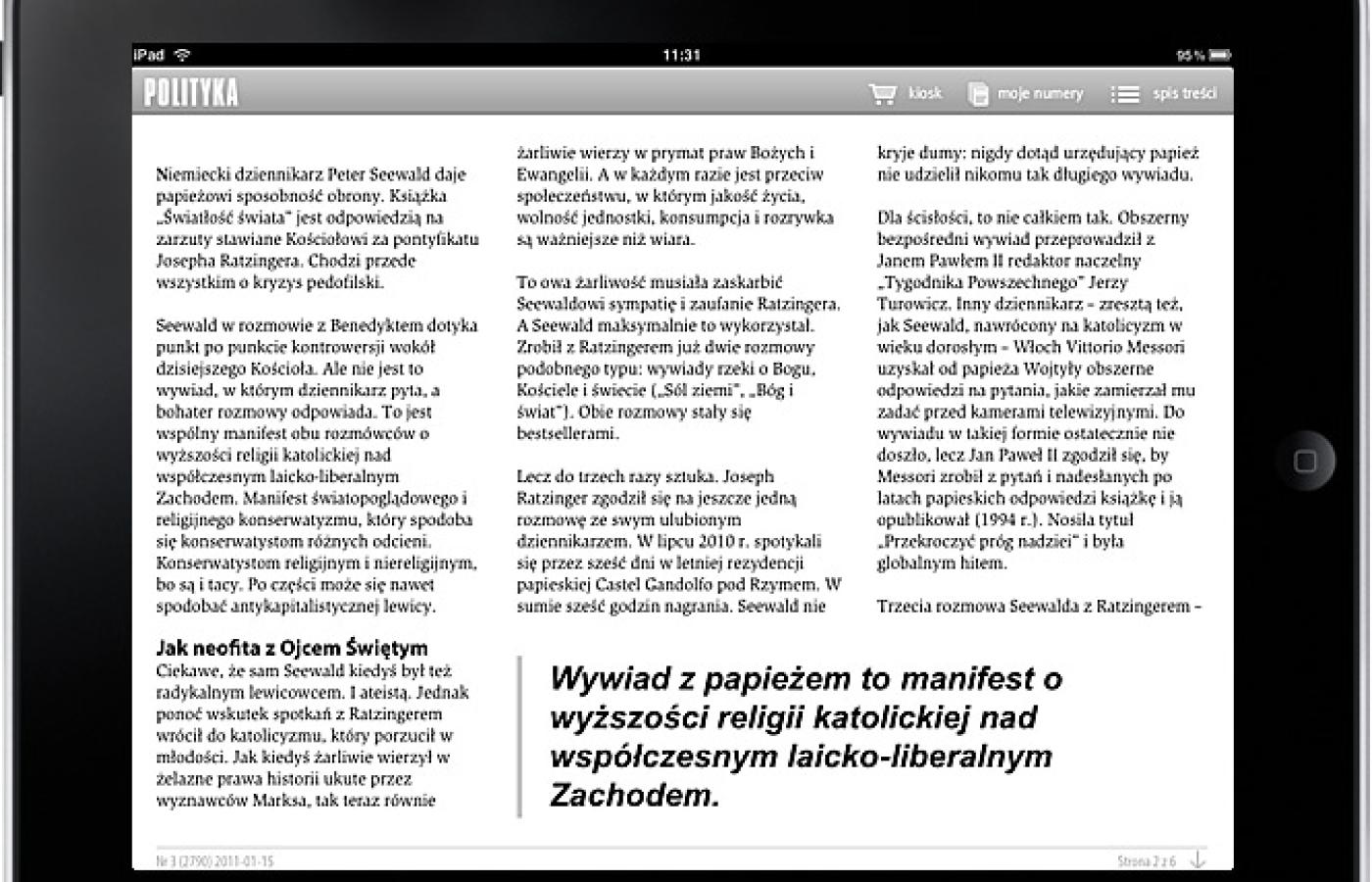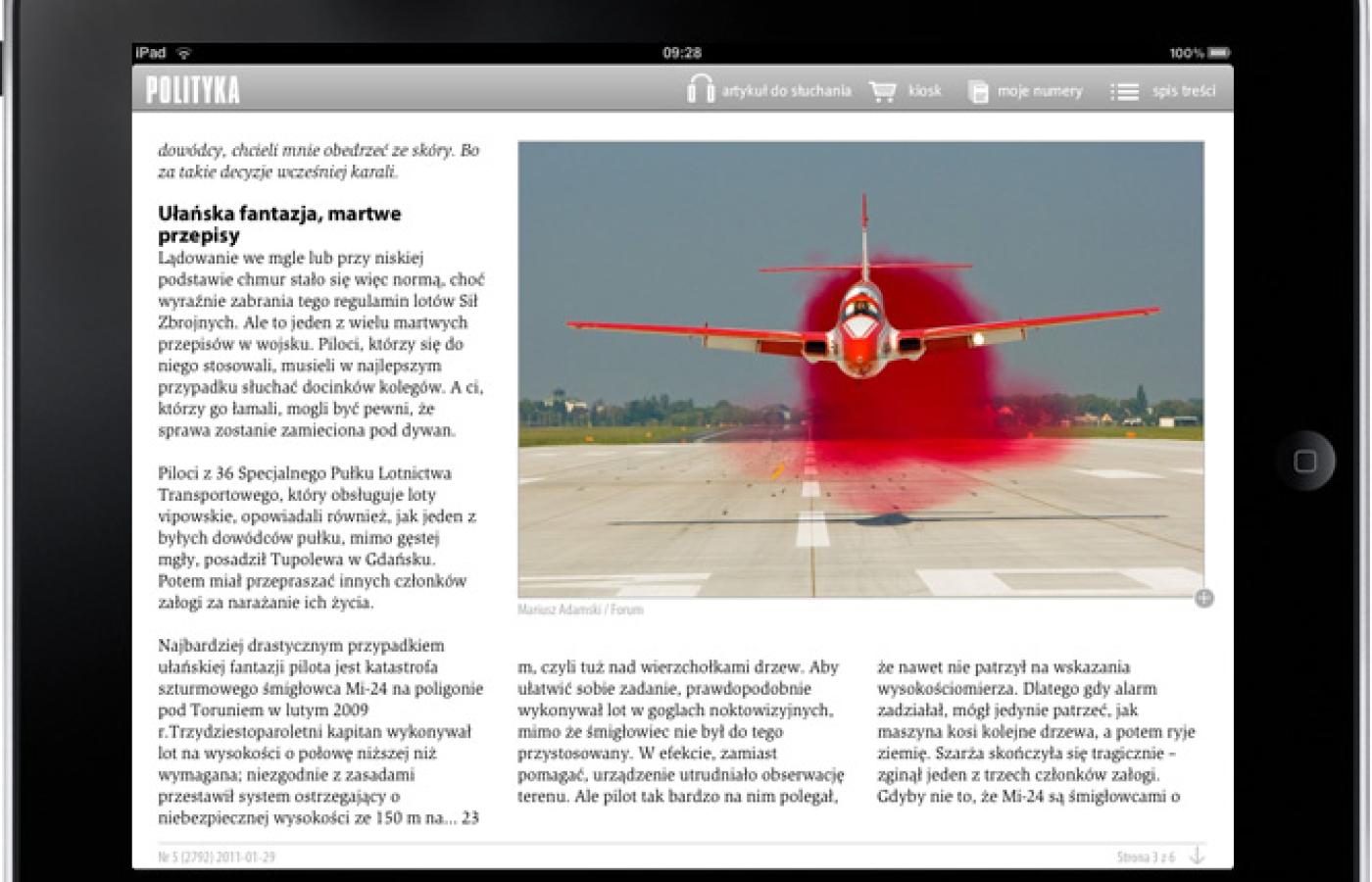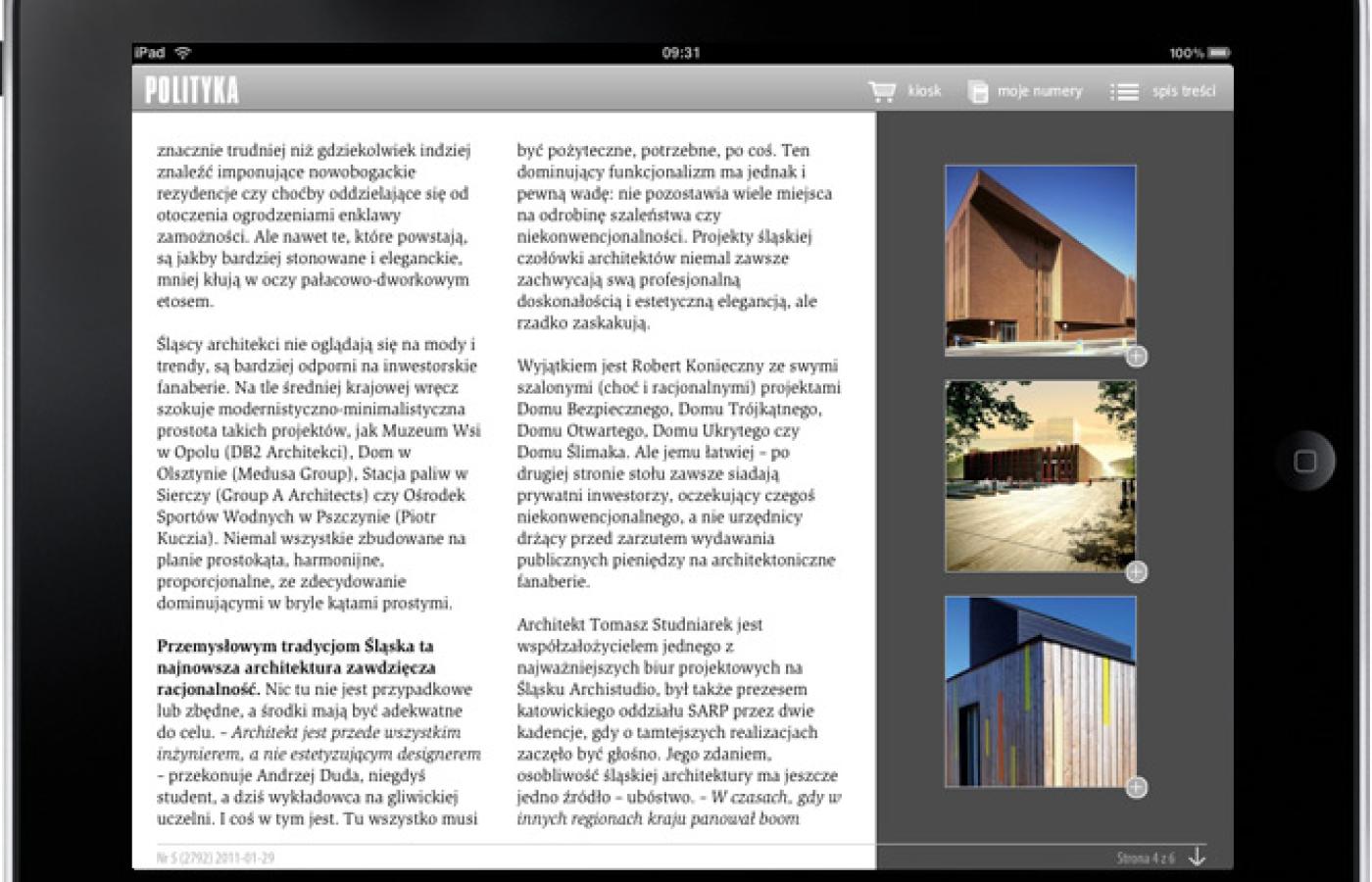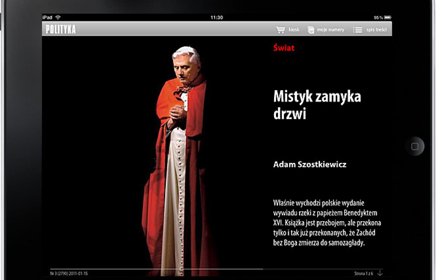 Z prawdziwą satysfakcją przedstawiamy wydanie POLITYKI na iPada. Dołożyliśmy starań, by nasza aplikacja była prosta w użyciu i funkcjonalna. Wiemy, że nasi Czytelnicy nade wszystko cenią sobie dobry tekst. Mamy jednak nadzieję, że także w szacie graficznej na tablecie odnajdą ducha POLITYKI.