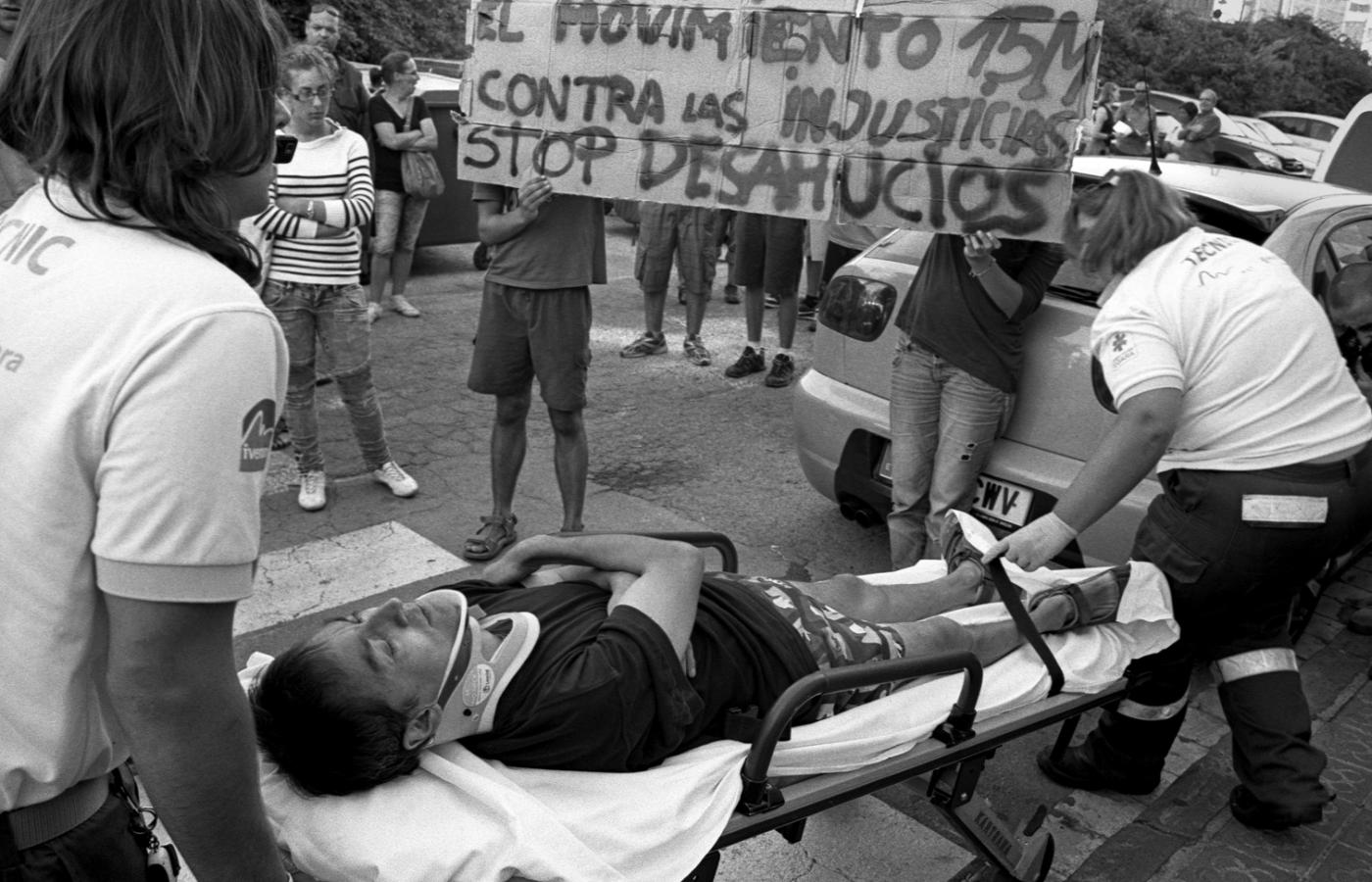 16 listopada 2011 Galerie Hiszpan spada z byka - galeria 16 listopada 2011 Specjalne jednostki przeciwko zamieszkom okrążyły plac Kataloński, aby odciąć drogę uczestnikom manifestacji Ruchu 15 Maja. Hanna Jarząbek / Polityka Hiszpania szykuje się do politycznej zmiany, ale w zmiany na lepsze już nie wierzy. Hanna Jarząbek/Polityka „STOP EKSMISJOM”. Santiago z Ekwadoru nie jest w stanie spłacać swojej hipoteki, rodzinę czeka eksmisja. Hanna Jarząbek/Polityka Santiago przeszedł załamanie nerwowe, ma za sobą trzy próby samobójcze. Hanna Jarząbek/Polityka Elisa (z córką) zbiera podpisy pod inicjatywą postulującą zmianę hiszpańskiego prawa hipotecznego. Ją samą eksmitowano z mieszkania. Hanna Jarząbek/Polityka Na czas eksmisji Elisa zostawiła córkę u matki. Jeśli dzieci są obecne podczas eksmisji, sąd może je umieścić w ośrodku opieki społecznej i rozpocząć postępowanie o odebranie praw rodzicielskich. Hanna Jarząbek/Polityka Elisa z mężem po eksmisji, z prawej jedna z założycielek Platformy Poszkodowanych przez Hipoteki w Barcelonie. Hanna Jarząbek/Polityka Luis z podczas manifestacji w sądzie. Walczył o umorzenie 200 tys. euro bankowego długu. Przez 10 miesięcy mieszkał w przyczepie. Bank zgodził się oddać dom, ale nie podał warunków, na jakich to będzie możliwe. Hanna Jarząbek/Polityka Członkowie Platformy starają się zablokować eksmisje. Często dochodzi wtedy do starć z policją, a manifestanci zostają ranni. Hanna Jarząbek/Polityka Manifestacja Ruchu 15 Maja przed parlamentem katalońskim w dzień głosowania nad planowanymi cięciami budżetowymi, Barcelona. Hanna Jarząbek/Polityka W Hiszpanii przeprowadza się już do 200 eksmisji dziennie. Hanna Jarząbek/Polityka Ruch Oburzonych, który zaistniał na placu del Sol w Madrycie, szybko rozprzestrzenił się na inne miasta Hiszpanii. Na fot. Barcelona. Hanna Jarząbek/Polityka Hiszpania w ciągu ostatnich trzech lat z mekki imigrantów stała się krajem emigrantów. Więcej na ten tematHiszpania: wybory wygrali konserwatyści W niedzielę wybory w Hiszpanii Hiszpanie pytają jak żyć