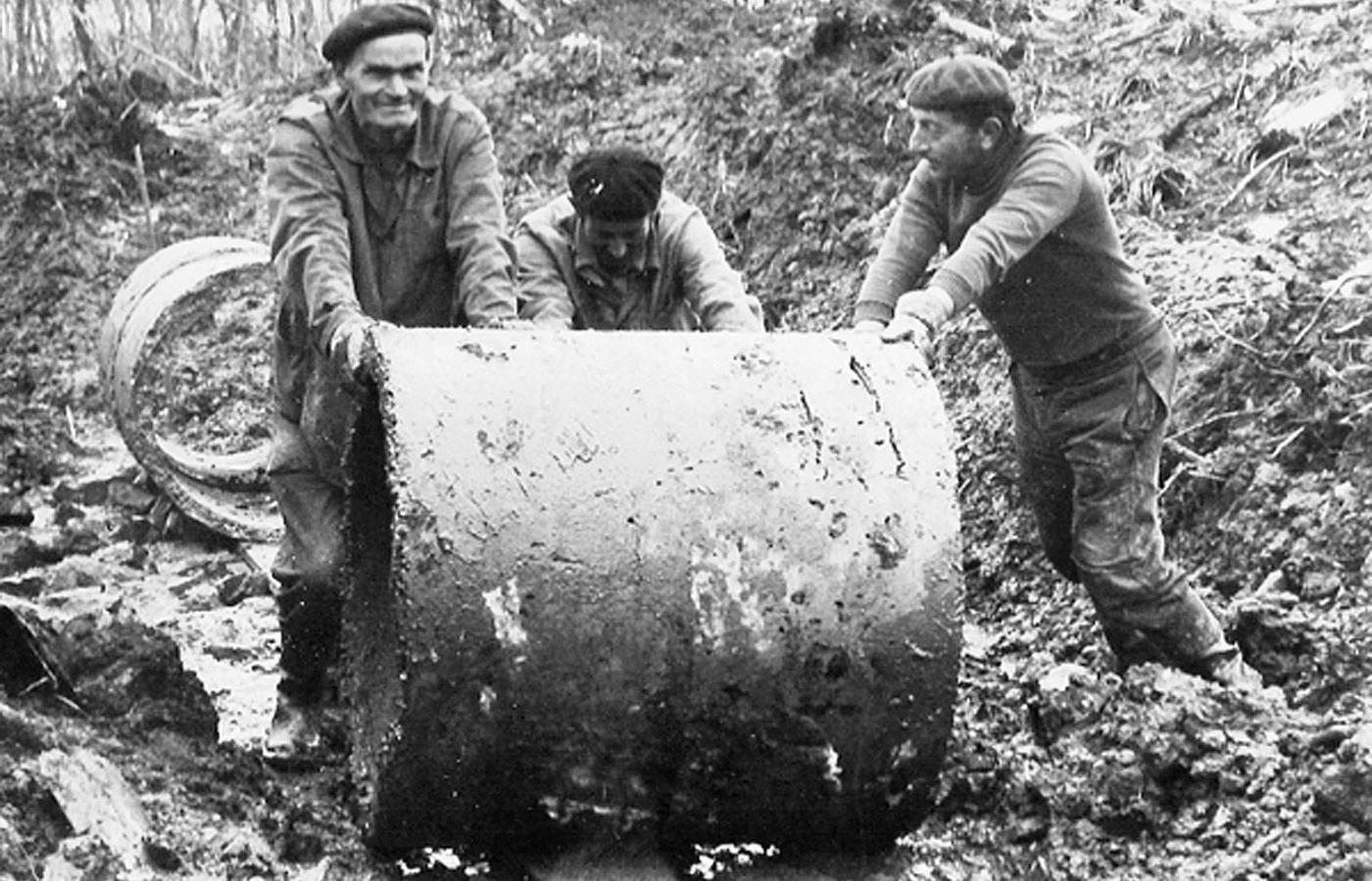 Do przetaczania takich betonowych kręgów trzeba było mieć krzepę. Od lewej: Władysław Potoczny, Tadeusz Froń, Władysław Nogaj.Ze zbiorów Krzysztofa Potaczały/materiały prasowe Do przetaczania takich betonowych kręgów trzeba było mieć krzepę. Od lewej: Władysław Potoczny, Tadeusz Froń, Władysław Nogaj.