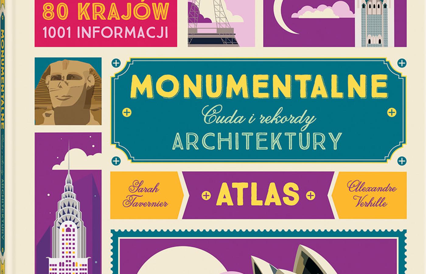 Sarah Tavernier (tekst, ilustracje), Alexandre Verhille (tekst, ilustracje), <b>Monumentalne cuda architektury</b>, Wydawnictwo Dwie Siostry. Wielkoformatowa publikacja to obrazkowy leksykon poświęcony światowej architekturze. Szczęśliwie nie jest on europocentryczny i nie stara się uwzględniać tylko najbardziej znanych, symbolicznych obiektów. Znajdziemy tu zarówno starożytne, znane wszystkim zabytki, jak i architekturę współczesną, również z takimi realizacjami jak nagrodzone w branży przedszkole w Wietnamie. Książka stworzona przy pomocy wektorowych ilustracji, gdzie obok samych budynków znajdziemy całkiem sporo rozmaitych danych, może początkowo wydawać się trochę przeładowana wizualnie. Ale po kilku planszach oko zaczyna się przyzwyczajać.