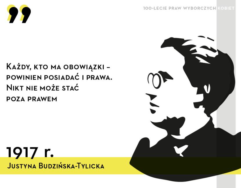 Justyna Budzińska-Tylicka (1867–1936) – ginekolożka, działaczka społeczna, propagatorka idei świadomego macierzyństwa, wieloletnia radna Warszawy. Z jej inicjatywy we wrześniu 1917 r. zwołano Zjazd Kobiet Polskich, który odegrał decydującą rolę w walce o powszechne prawa wyborcze „bez różnicy płci”. W 1931 r. została skazana na rok więzienia (w zawieszeniu) za udział w demonstracji przeciwko uwięzieniu przywódców opozycji parlamentarnej.