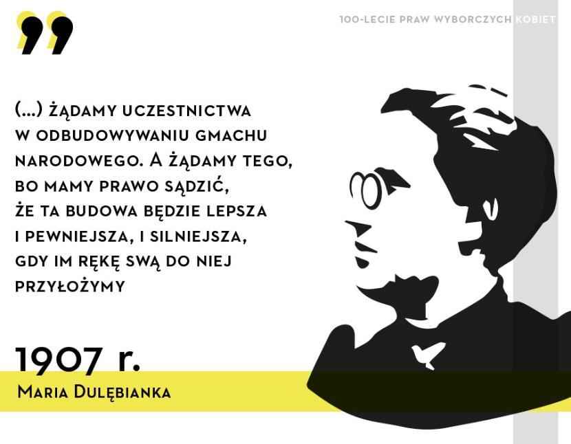 Maria Dulębianka (1861–1919) – malarka, działaczka społeczno-polityczna, partnerka życiowa Marii Konopnickiej. Regularnie publikowała w warszawskim „Sterze”, w latach 1911–13 redagowała „Głos Kobiet” (dodatek do „Kuriera Lwowskiego”). Mimo że kobiety nie miały praw wyborczych, w 1908 r. Dulębianka demonstracyjnie kandydowała do Sejmu Krajowego we Lwowie. Uzyskała 511 głosów i choć je unieważniono, to całe wydarzenie pozwoliło nagłośnić kwestię politycznego równouprawnienia. W 1918 r. przemawiała podczas audiencji u Józefa Piłsudskiego, domagając się w imieniu delegacji kobiet natychmiastowego przyznania Polkom pełnych praw wyborczych w chwili odzyskania niepodległości.