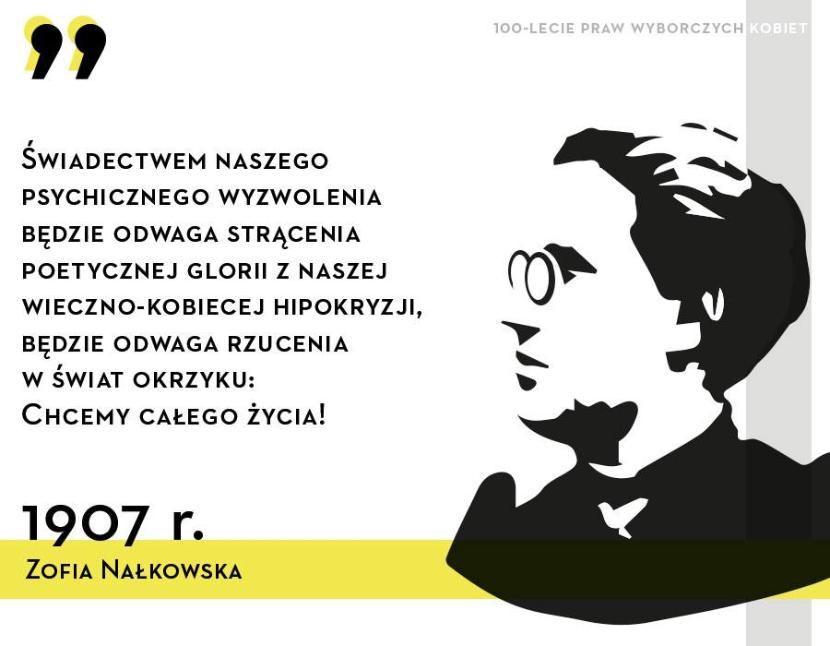 Zofia Nałkowska (1884–1954)– powieściopisarka, diarystka, publicystka. W swoich wczesnych powieściach podnosiła temat równouprawnienia przede wszystkim na płaszczyźnie obyczajowej i seksualnej. Ale Zofii Nałkowskiej nie można nazwać działaczką kobiecą, jej teoretyczna refleksja nad kobiecością nie przekładała się na konkretną aktywność społeczną i publicystyczną. Przywołane słowa Nałkowska wygłosiła podczas Zjazdu Kobiet zorganizowanego z okazji 40-lecia pracy twórczej Elizy Orzeszkowej w Warszawie w 1907 r. i „jako głos najmłodszych wywołał prawdziwy skandal”. Reporterka „Dziennika Wileńskiego” referowała: „Skandal doszedł do takich rozmiarów, że p. Konopnicka wraz z resztą prezydium opuściła zebranie, a uroczyste zamknięcie Zjazdu zostało zmienione”. Była to jedna z nielicznych wypowiedzi Nałkowskiej na temat emancypacji kobiet.