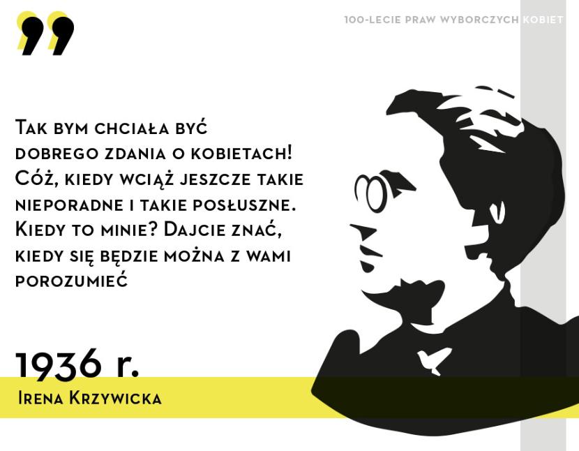 Irena Krzywicka (1899–1994)– krytyczka literacka i teatralna, powieściopisarka, publicystka, tłumaczka. Od 1924 r. stale współpracowała z „Wiadomościami Literackimi”, gdzie zamieszczała, oprócz recenzji, teksty publicystyczne poświęcone kwestii równouprawnienia (przede wszystkim w aspekcie cielesnym i seksualnym). Wspólnie z Tadeuszem Boyem-Żeleńskim angażowała się w działalność społeczną na rzecz edukacji seksualnej, planowania rodziny, liberalizacji prawa (zniesienie zakazu aborcji, kary śmierci). Irena Krzywicka współtworzyła Poradnię Świadomego Macierzyństwa i Ligę Reformy Obyczajów.