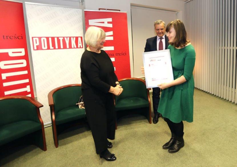 Anna Dobrowolska odbiera dyplom za I Nagrodę i gratulacje od Jerzego Baczyńskiego i Elżbiety Kępińskiej.