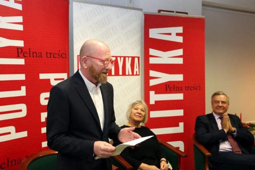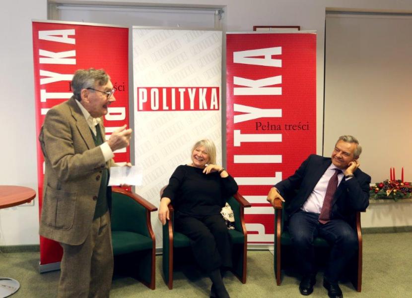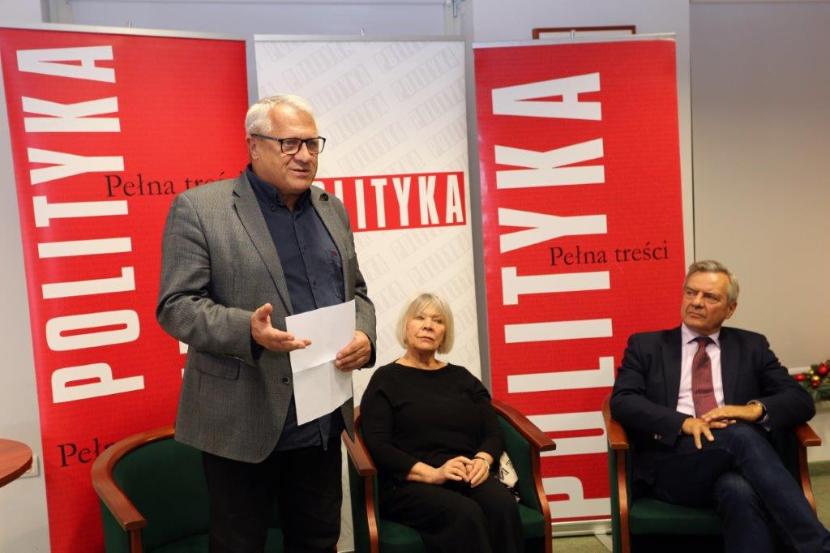 Przewodniczący jury Wiesław Władyka uzasadnia tegoroczny wybór. W tle Elżbieta Kępińska, żona Mieczysława F. Rakowskiego, oraz redaktor naczelny POLITYKI Jerzy Baczyński.