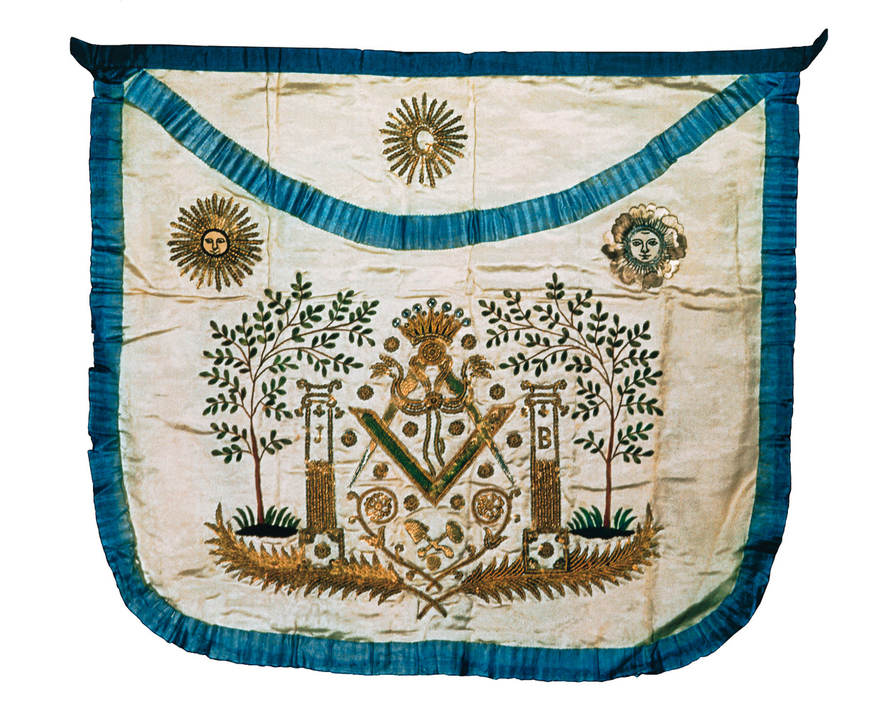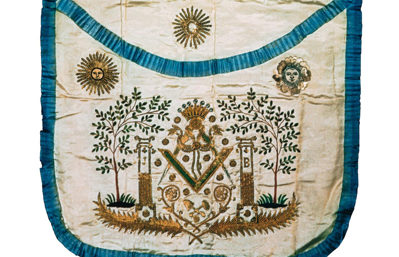 Fartuszek masoński z charakterystycznymi symbolami: cyrklem i węgielnicą, kolumnami, słońcem, gwiazdą oraz akacją. Fartuszek masoński z charakterystycznymi symbolami: cyrklem i węgielnicą, kolumnami, słońcem, gwiazdą oraz akacją. BEW
