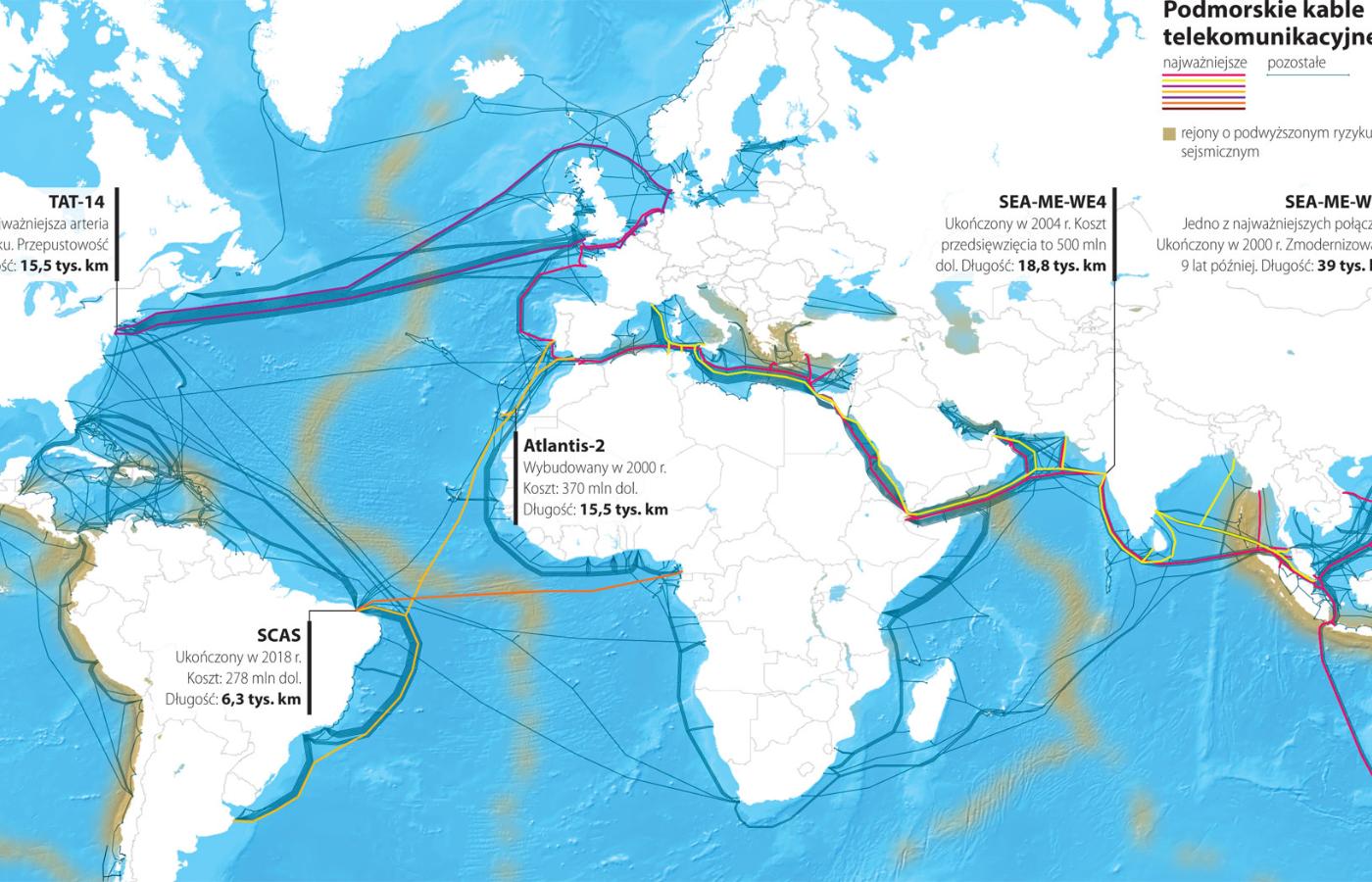 Zamówienie dostawy chińskiego produktu w nader atrakcyjnej cenie. Skontaktowanie się z firmą obsługującą ubezpieczenie osobiste, która przeniosła swoje centrum informacyjne do Indii. Dokonanie zlecenia codziennych transakcji finansowych obsługiwanych przez serwer na drugim końcu świata. Bieżące zarządzanie ruchem milionów kontenerów przez międzynarodowych spedytorów. Wreszcie powszechny dostęp do rozrywki dostarczanej zza oceanu. Wszystko to wymaga przepływu informacji w wymiarze międzykontynentalnym. Intuicyjnie skłonni jesteśmy wiązać kluczowe dla funkcjonowania współczesnej cywilizacji arterie przesyłu informacji z łącznością satelitarną. To błąd. Na kosmos przypada tylko 3 proc. całości przekazów. 97 proc. jest realizowane za pomocą kabli podmorskich.