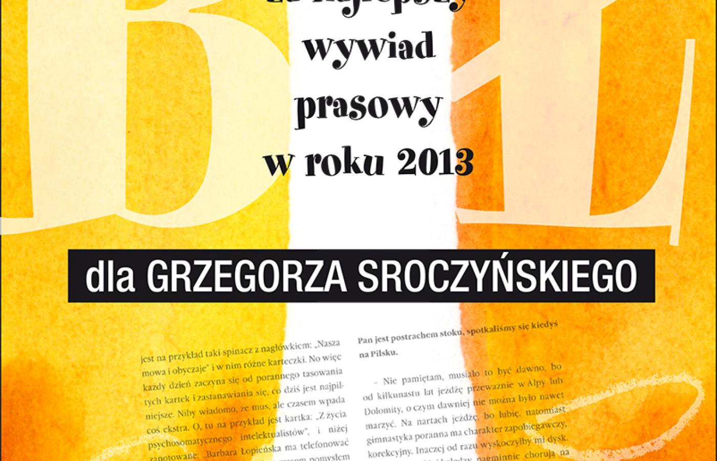 Kapituła Nagrody wyróżniła go za rozmowę przeprowadzoną z prof. Karolem Modzelewskim („Wkurzył się Pan? Świetnie!”), opublikowaną w Magazynie Świątecznym „Gazety Wyborczej” 14 września 2013 r. W finale znalazł się także jego drugi wywiad - z Małgorzatą Terlikowską („Wysokie Obcasy”, 23 marca 2013 r.).