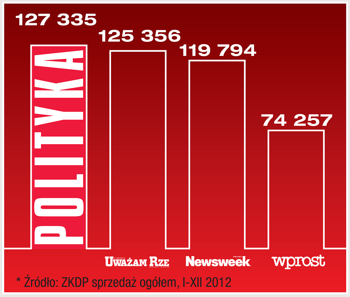 W otoczeniu konkurencyjnym naszego tygodnika wrze, ale sytuacja POLITYKI jest – jak zwykle zresztą – bardzo stabilna. W 2012 r., podobnie jak w poprzednich siedmiu latach byliśmy najchętniej kupowanym tygodnikiem opinii. Ze średnią sprzedażą 127 335 egz. jesteśmy liderem rynku. Wyprzedziliśmy „Uważam Rze” (125 356 egz.), które w związku z perturbacjami na linii wydawca–redaktor w grudniu straciło połowę sprzedaży i już raczej w konkurencji tygodnikowej się nie liczy. Sprzedawaliśmy też średnio o prawie 53 tys. egz. więcej niż „Wprost” (74 257 egz.