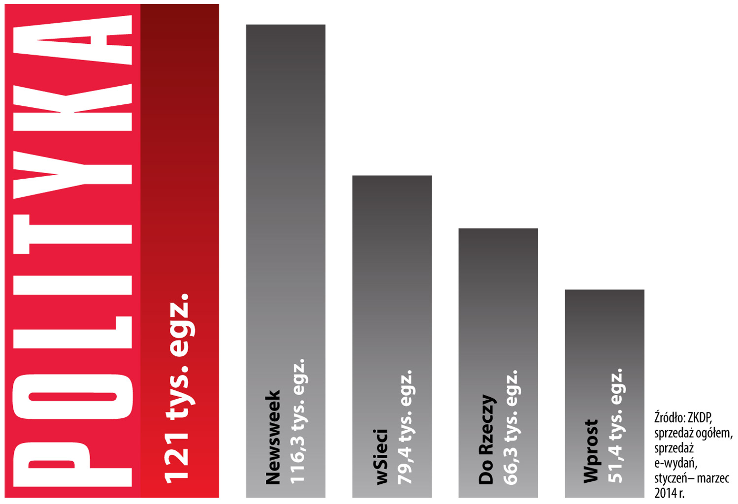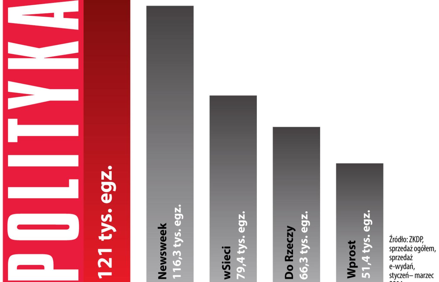 Powiększa się dystans pomiędzy sprzedażą POLITYKI a pozostałymi tygodnikami opinii – wynika z najnowszych danych Związku Kontroli Dystrybucji Prasy. Z wynikiem 121 tys. egzemplarzy POLITYKA odnotowała w pierwszym kwartale 2014 r. najwyższą sprzedaż spośród wszystkich tytułów segmentu i była tym samym najchętniej kupowanym tygodnikiem społeczno-politycznym w Polsce. Na drugim miejscu – ze średnią sprzedażą 116, 3 tys. egz. – znalazł się „Newsweek”. Sprzedaż pozostałych tygodników spadła poniżej 80 tys. egz. „wSieci”, który uplasował się na trzecim miejscu w zestawieniu, sprzedawał średnio 79,4 tys. egz., „Do Rzeczy” – 66,3 tys. egz., zaś „Wprost” – 51,4 tys. egz.