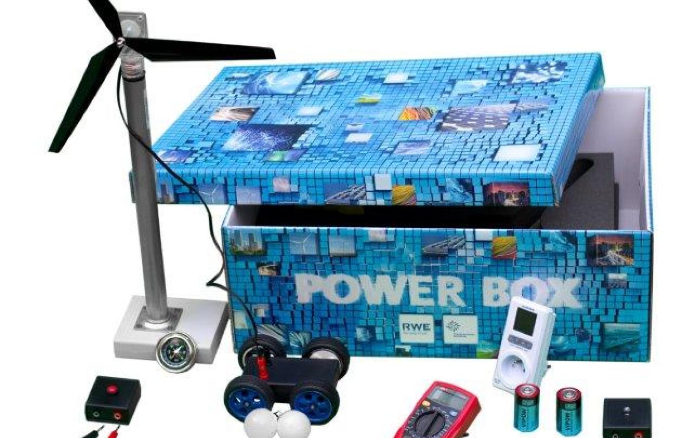W efekcie tych rekomendacji, jako odpowiedź na oczekiwania rodziców powstał RWE Power Box – zestaw elementów i urządzeń mieszczący się w dużym kartonowym pudełku. W środku znajdują się m.in.: miniaturowy panel fotowoltaiczny, wiatrak, silnik elektryczny oraz zestaw kabli. Bardzo szybko z różnych elementów uczniowie mogą samodzielnie zbudować i przetestować miniaturową elektrownię słoneczną, nieduży nowoczesny wiatrak, czy samochód elektryczny. Sprawdzić ile energii zużywają różne źródła światła i na czym polega funkcja „stand-by” w urządzeniach elektrycznych. W zestawie znajduje się też: