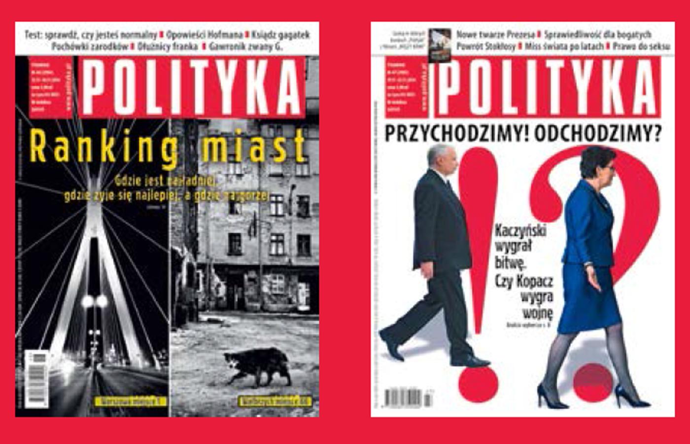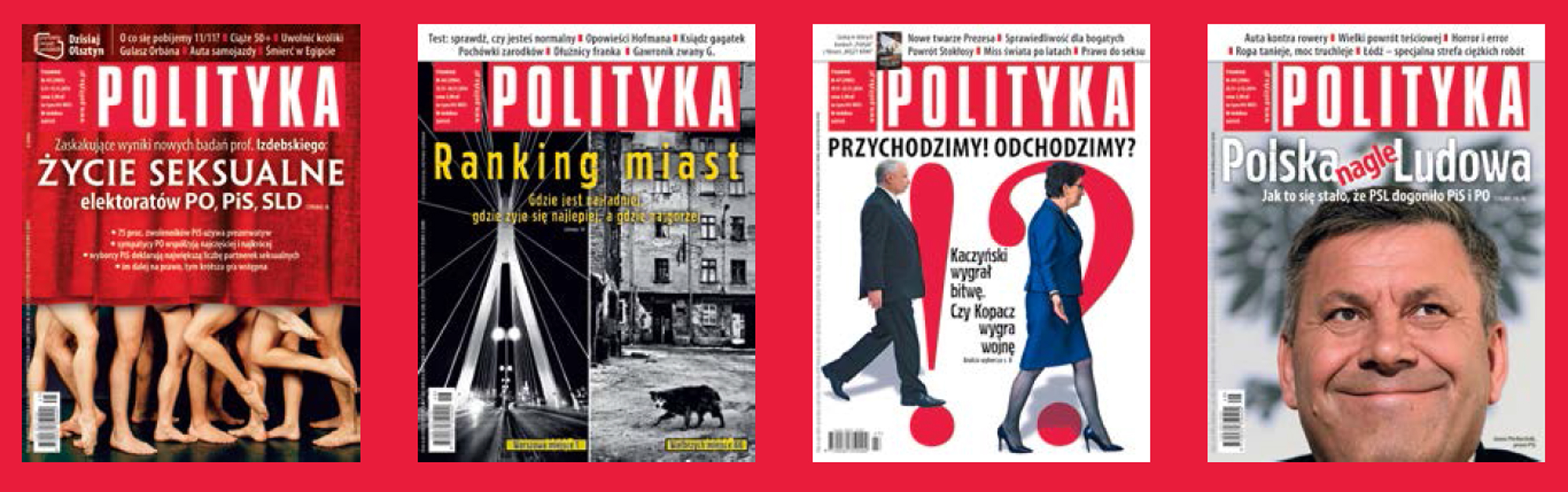 Średnia sprzedaż POLITYKI w okresie styczeń–grudzień 2014 r. wyniosła 121,3 tys. egz. i była tylko nieznacznie niższa (3 proc.) od sprzedaży w 2013 r. Na drugim miejscu znalazł się „Newsweek” ze średnią sprzedażą 118,6 tys. egz. i spadkiem w stosunku do 2013 r. o 6 proc. Na trzecim miejscu uplasował się tygodnik „wSieci”, który sprzedawał średnio 77,1 tys. egz. i odnotował spadek sprzedaży o 18 proc. Kolejne miejsca w zestawieniu przypadły tygodnikom „Do Rzeczy” – z wynikiem 60,4 tys. średnio sprzedanych egzemplarzy i spadkiem aż o 30 proc., oraz „Wprost” – który sprzedawał średnio 58,2 tys. egz., czyli o 6 proc. mniej niż w 2013 r.