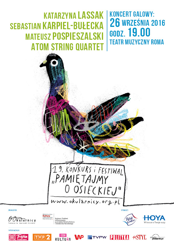Werdykt Jury zostanie ogłoszony podczas Koncertu Galowego w Teatrze Muzycznym ROMA (26.09.2016r., godz. 19.00). Tego wieczoru odbędzie się także koncert „Gonią wilki za owcami” w opracowaniu muzycznym Mateusza Pospieszalskiego, inspirowany różnymi tradycjami – muzyki gór, klasycznej i popularnej. Koncert ten będzie ukłonem w stronę twórczości m. in. Katarzyny Gaertner, Adama Sławińskiego i Andrzeja Zielińskiego, którzy w swoich kompozycjach do słów Agnieszki Osieckiej w sposób bardzo subtelny czerpali z różnych kultur i gatunków muzycznych. Piosenki Agnieszki Osieckiej zaśpiewają i zagrają pochodząca z Zakopanego skrzypaczka i wokalistka Katarzyna Lassak oraz gościnnie Sebastian Karpiel-Bułecka. W koncercie wystąpi też jeden z najciekawszych jazzowych kwartetów smyczkowych Atom String Quartet. To będzie żywiołowy, multiinstrumentalny i niepowtarzalny koncert! Bilety dostępna na eBilet.pl oraz bilety.teatrroma.pl i w kasach Teatru ROMA.
