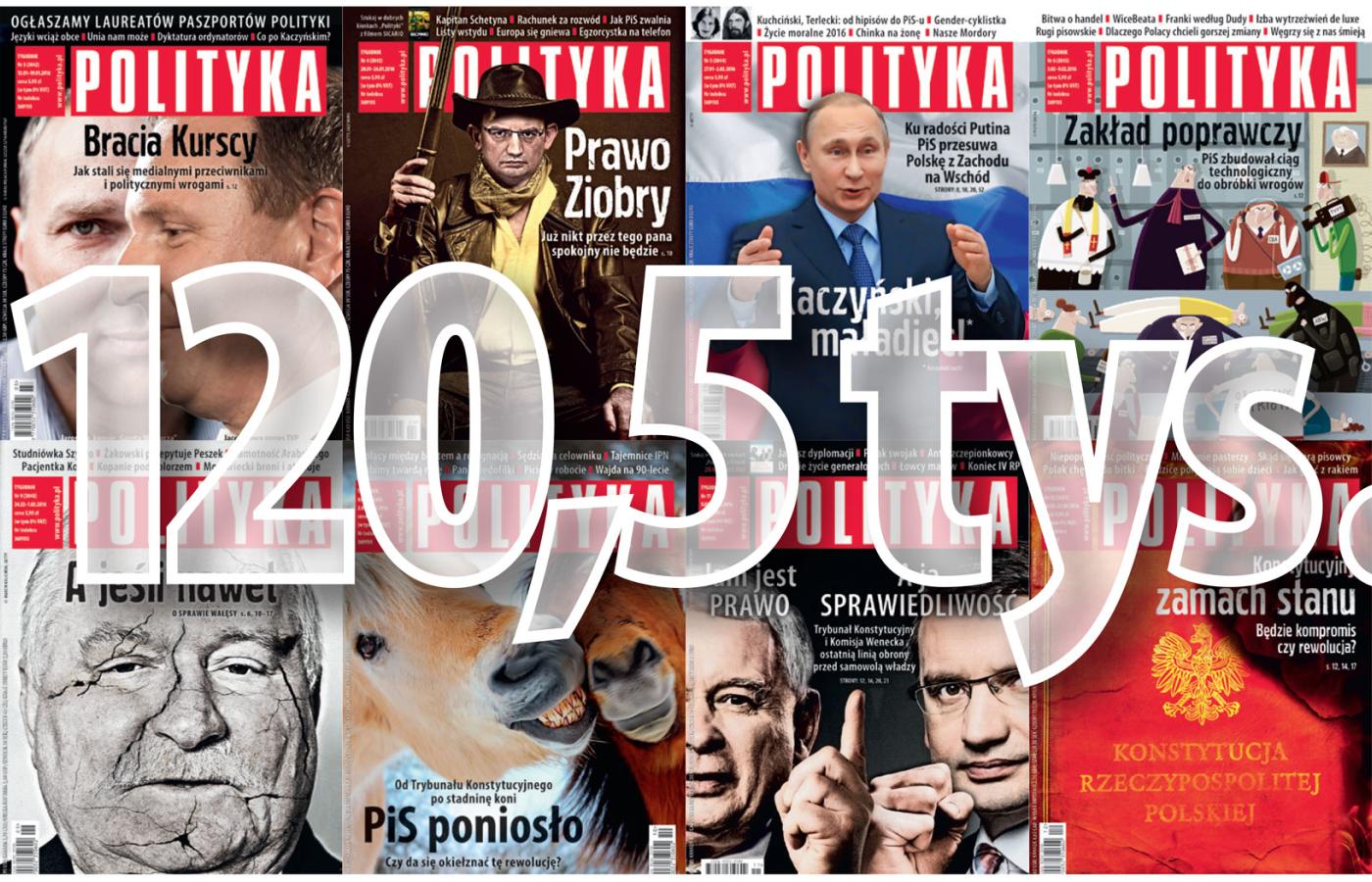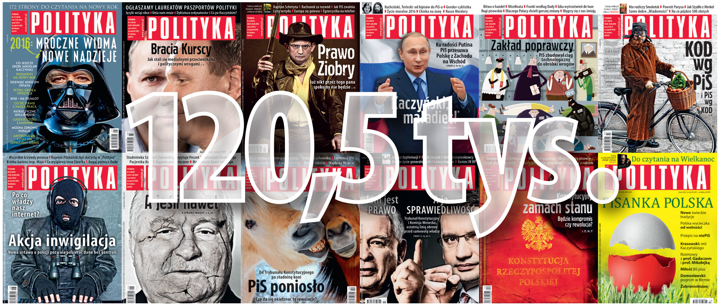 Według najnowszych danych Związku Kontroli Dystrybucji Prasy POLITYKA odnotowała najwyższą sprzedaż spośród wszystkich tygodników opinii w pierwszym kwartale 2016 r. Z wynikiem 120,5 tys. egzemplarzy i wzrostem sprzedaży (o 1,1 proc.) w stosunku do pierwszego kwartału poprzedniego roku nasz tygodnik był najchętniej kupowanym tytułem w segmencie. Na drugim miejscu – ze średnią sprzedażą 119,5 tys. egz. – znalazł się „Newsweek”. Tygodnik „wSieci” uplasował się na trzecim miejscu w zestawieniu – w tym czasie sprzedawał średnio 78,3 tys. egz. Pozostałe tygodniki, czyli „Do Rzeczy” i „Wprost”, sprzedawały odpowiednio: 59 tys. egz. i 28,4 tys. egz.