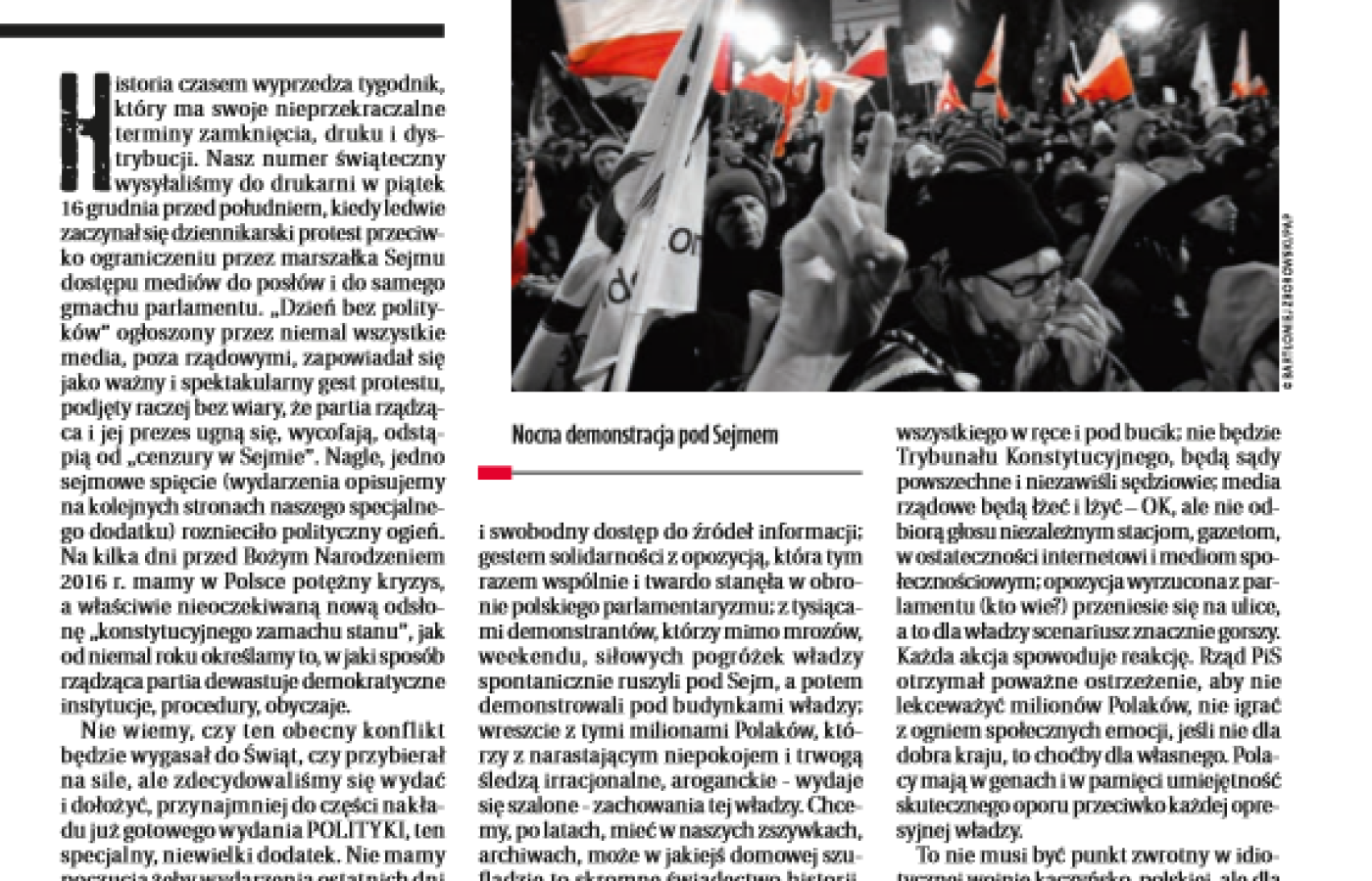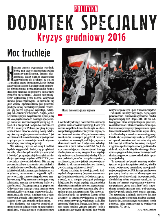 Wraz ze świątecznym, podwójnym wydaniem POLITYKI, która trafi do kiosków w najbliższy poniedziałek (19 grudnia), ukaże się specjalny, 4-stronicowy dodatek Kryzys grudniowy 2016.