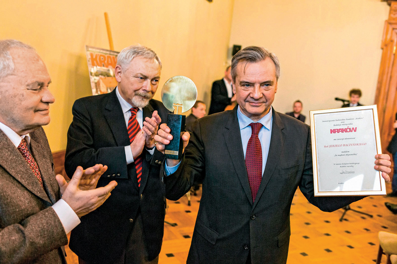 W zorganizowanej 2 marca w krakowskim magistracie uroczystości uczestniczyli przedstawiciele lokalnej elity: naukowcy, samorządowcy, ludzie kultury, mediów, biznesu, a także laureaci Medalu z lat ubiegłych, profesorowie Andrzej Romanowski i Bronisław Łagowski, oraz autorzy POLITYKI związani z Krakowem – Adam Szostkiewicz, Jan Hartman, Krzysztof Burnetko, Malwina Dziedzic. Laudację wygłosił prof. Wiesław Władyka, który zwracał uwagę na ogromne zaangażowanie Jerzego Baczyńskiego w prowadzenie gazety i troskę o jej jakość.