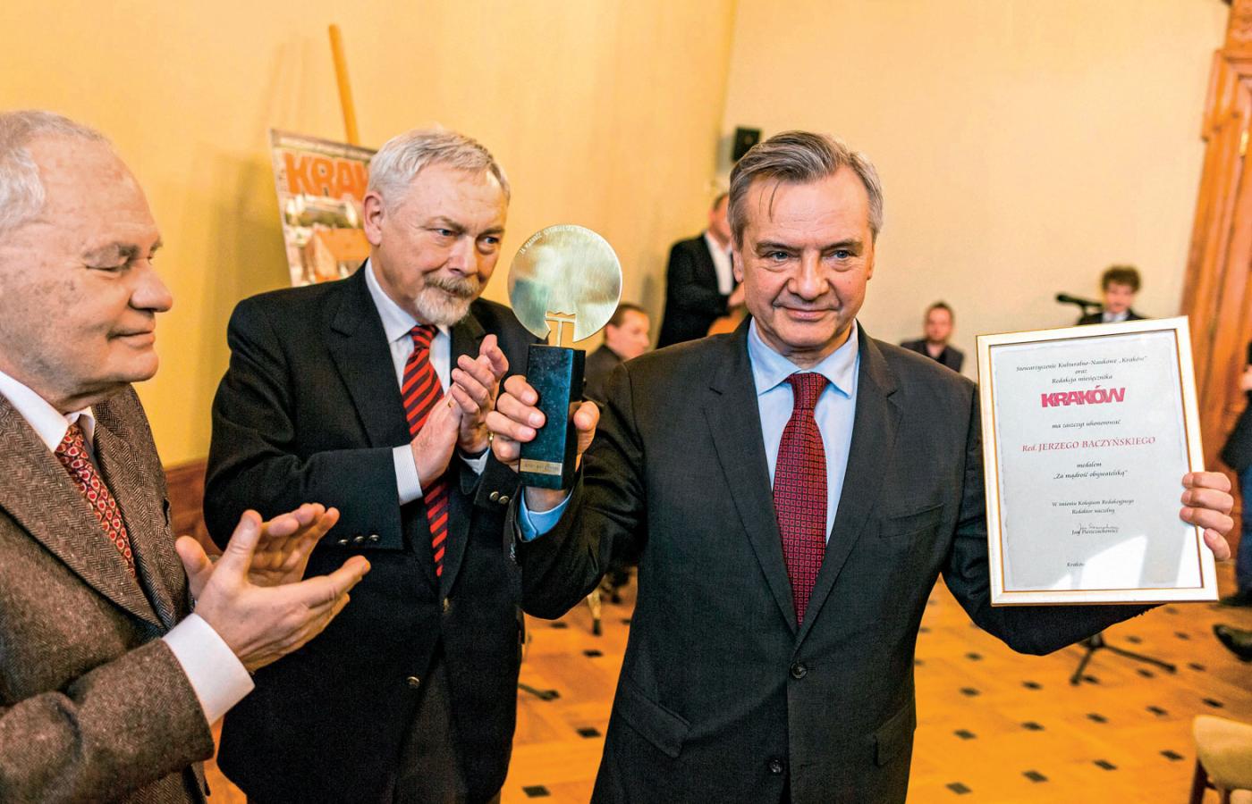 Z dumą odnotowujemy, że redaktor naczelny POLITYKI odebrał w ubiegłym tygodniu z rąk prezydenta miasta Krakowa Jacka Majchrowskiego oraz redaktora naczelnego miesięcznika społeczno-kulturalnego „Kraków” Jana Pieszczachowicza Medal „Za mądrość obywatelską”. Wyróżnienie przyznawane jest raz w roku przez Stowarzyszenie Kulturalno-Naukowe Kraków oraz miesięcznik „Kraków” za „szczególne zasługi i odwagę w obronie zasad demokracji oraz społeczeństwa obywatelskiego, za rzetelność i profesjonalizm oraz za przestrzeganie zasad przyzwoitości publicznej”.