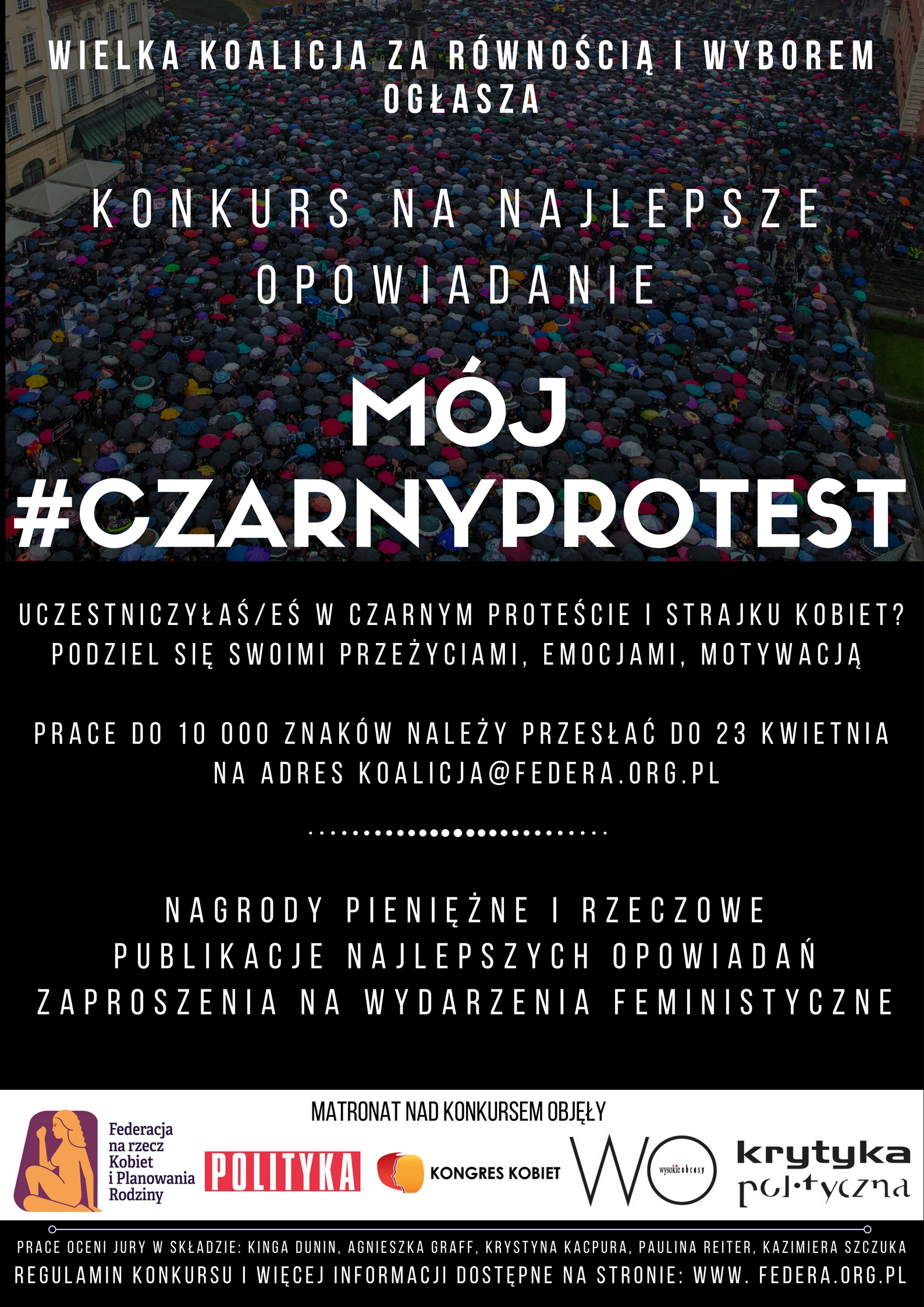 Prace konkursowe, do 10 tysięcy znaków, należy wysłać do dnia 23 kwietnia 2017 roku, na adres: koalicja@federa.org.pl, w tytule wpisując imię i nazwisko autora/ki oraz dopisek „konkurs – mój czarnyprotest”.