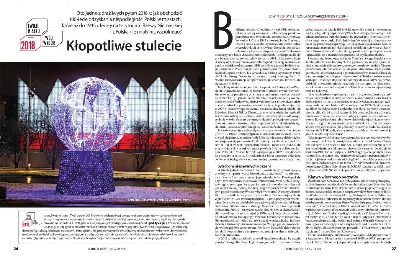 Ze zmiennymi uczuciami czytałam artykuł „Kłopotliwe stulecie” (POLITYKA 8) o obchodach 100-lecia niepodległości Polski na dawnych ziemiach niemieckich. Jestem rodowitą szczecinianką, urodzoną zaraz po wojnie, dorastającą w trudnych czasach, ale ze szczęśliwym dzieciństwem. (…) To prawda, że Szczecin, podobnie jak inne dawne niemieckie miasta, nie ma własnej, jednoznacznej tożsamości. Uważam, że jej świadome tworzenie nie było w powojennym okresie potrzebne i możliwe, taka świadomość pojawiła się na przełomie wieków. To, jak tworzyła się atmosfera miasta, zależało od ludzi, którzy tu (…) przybywali, i od tego, jakie zachowania czy tradycje ze sobą z różnych stron Polski przywozili. Faktem też jest, że na początku XXI w. była w Szczecinie fascynacja niemiecką przeszłością miasta, byli fetowani niemieccy artyści działający w przedwojennym mieście – moim zdaniem nawet z dużą przesadą. (…)