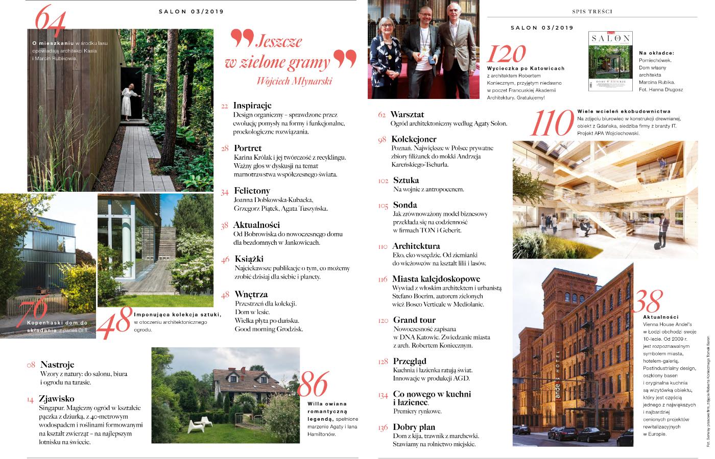 Najnowszy numer „Salonu” poświęcony jest naturze i ekologii – piszemy o zielonej architekturze, rolnictwie miejskim, designie organicznym i ekomateriałach wykorzystywanych w budownictwie i wzornictwie. Tak jak w poprzednim numerze inspirujemy pokazując najlepsze projekty domów i ogrodów, zrealizowane z wykorzystaniem innowacyjnych technologii, zrównoważonych materiałów i proekologicznych rozwiązań (m.in. dom w lesie pary architektów Marcina i Katarzyny Rubików; dom w angielskim ogrodzie, zaprojektowany przez Piotra i Dorotę Szaroszyków oraz zrewitalizowaną przez brytyjskiego architekta Iana Hamiltona ponad 100-letnią podwarszawską willę). Rozmawiamy z uznanymi architektami: ze Stefano Boeri, twórcą zielonych wieżowców na kształt lasów w Mediolanie oraz Robertem Koniecznym o innowacyjnych i zielonych Katowicach. Zachęcamy do ekologicznych nowinek oraz lektury najciekawszych książek poświęconych ekologii i życiu zgodnie z naturą.