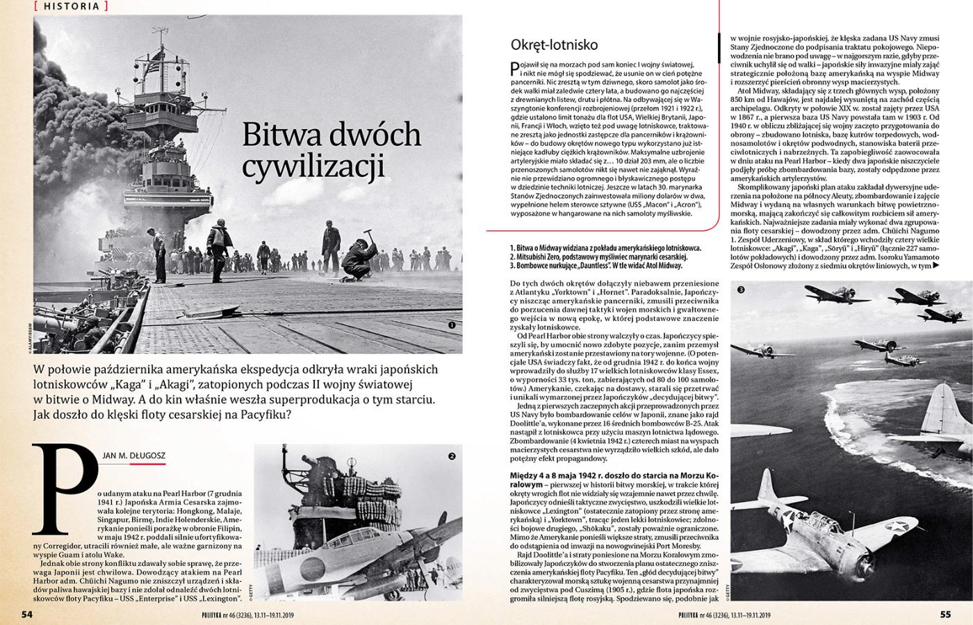 Jan M. Długosz napisał bardzo potrzebny – nie tylko w kontekście nowego filmu o Midway – artykuł poruszający mało u nas znany temat („Bitwa dwóch cywilizacji”, POLITYKA 46). Nawiasem mówiąc, sam film – jak się orientuję – nie dorównuje „Bitwie o Midway” z niezapomnianą kreacją Henry’ego Fondy z 1976 r.; podobnie jak „Pearl Harbor” w sensie faktograficznym jest kiepską próbą nawiązania do rewelacyjnego „Tora, Tora, Tora” z 1970 r. Autor popełnił jednak w końcówce swego tekstu parę istotnych przeinaczeń, które pozwolę sobie sprostować: