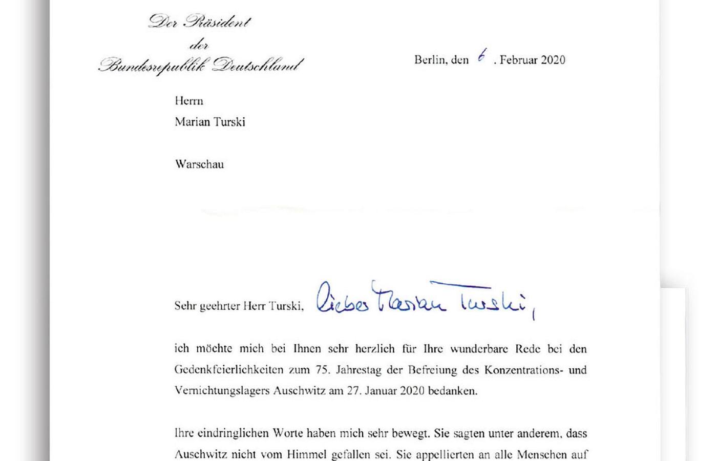 Z dumą odnotowujemy, że wśród wielu gratulacji i słów uznania, jakie wpłynęły do naszej redakcji po wystąpieniu naszego przyjaciela Mariana Turskiego podczas obchodów 75. rocznicy wyzwolenia Auschwitz, znalazł się również list od prezydenta Niemiec Franka-Waltera Steinmeiera. Jego tłumaczenie przytaczamy poniżej.