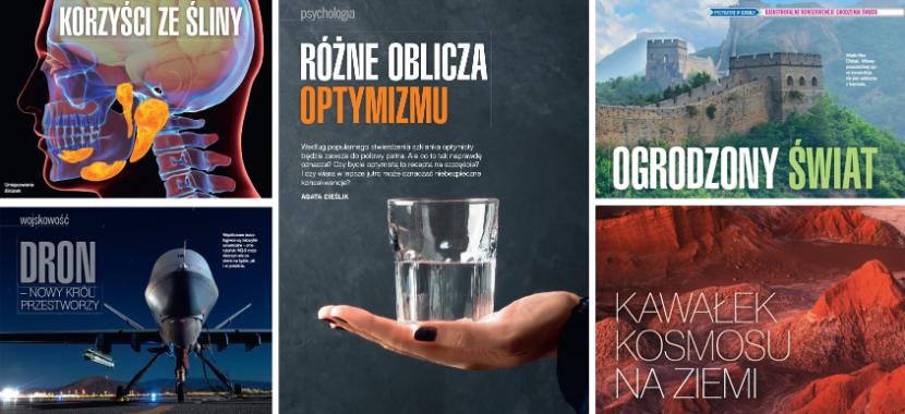 Tematem okładkowym tego numeru jest optymizm i jego różne oblicza. Agata Cieślik pokazuje, że bycie optymistą nie zawsze jest dobre i może mieć swoje niebezpieczne konsekwencje. Z tekstu dowiadujemy się także, jaka jest zależność między wiekiem a optymizmem, czy optymizm jest dziedziczny i czy da się go badać u zwierząt.