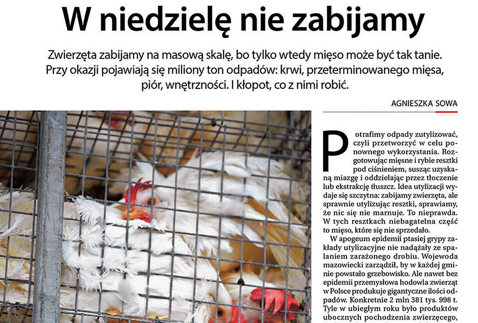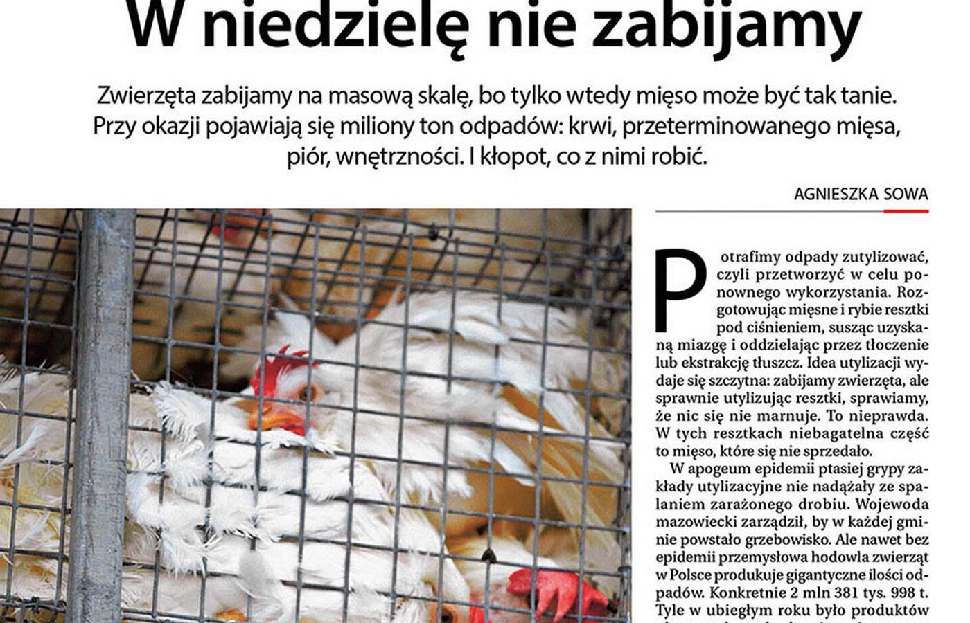 Pragnę podziękować redakcji za stałe powracanie do tematyki praw zwierząt i szeroko rozumianej ochrony przyrody. Dziękuję za niezwykle wstrząsający tekst Agnieszki Sowy „W niedzielę nie zabijamy” (POLITYKA 28). Artykuły red. Sowy dotyczące traktowania zwierząt są drastyczne i zapewne dlatego bardzo trudne do napisania, a również – niezwykle trudne do czytania. Część wrażliwych mięsożerców powie: „ja tego nie mogę czytać” i wróci do ulubionego kotlecika. Ale część może jednak uświadomi sobie, co dzieje się ze zwierzętami w dobie przemysłowej „produkcji” żywności. Trzeba tak pisać nadal!