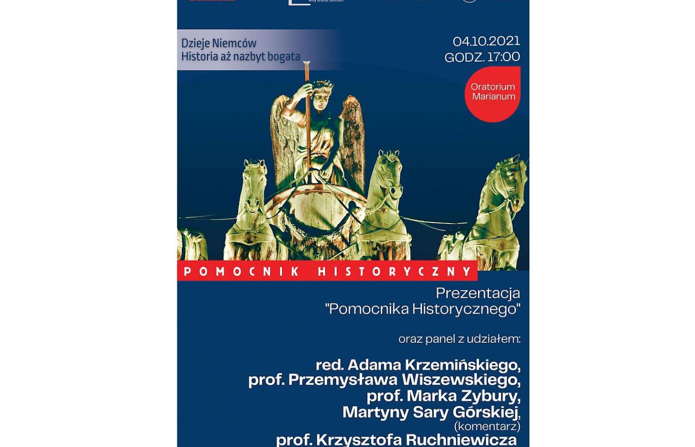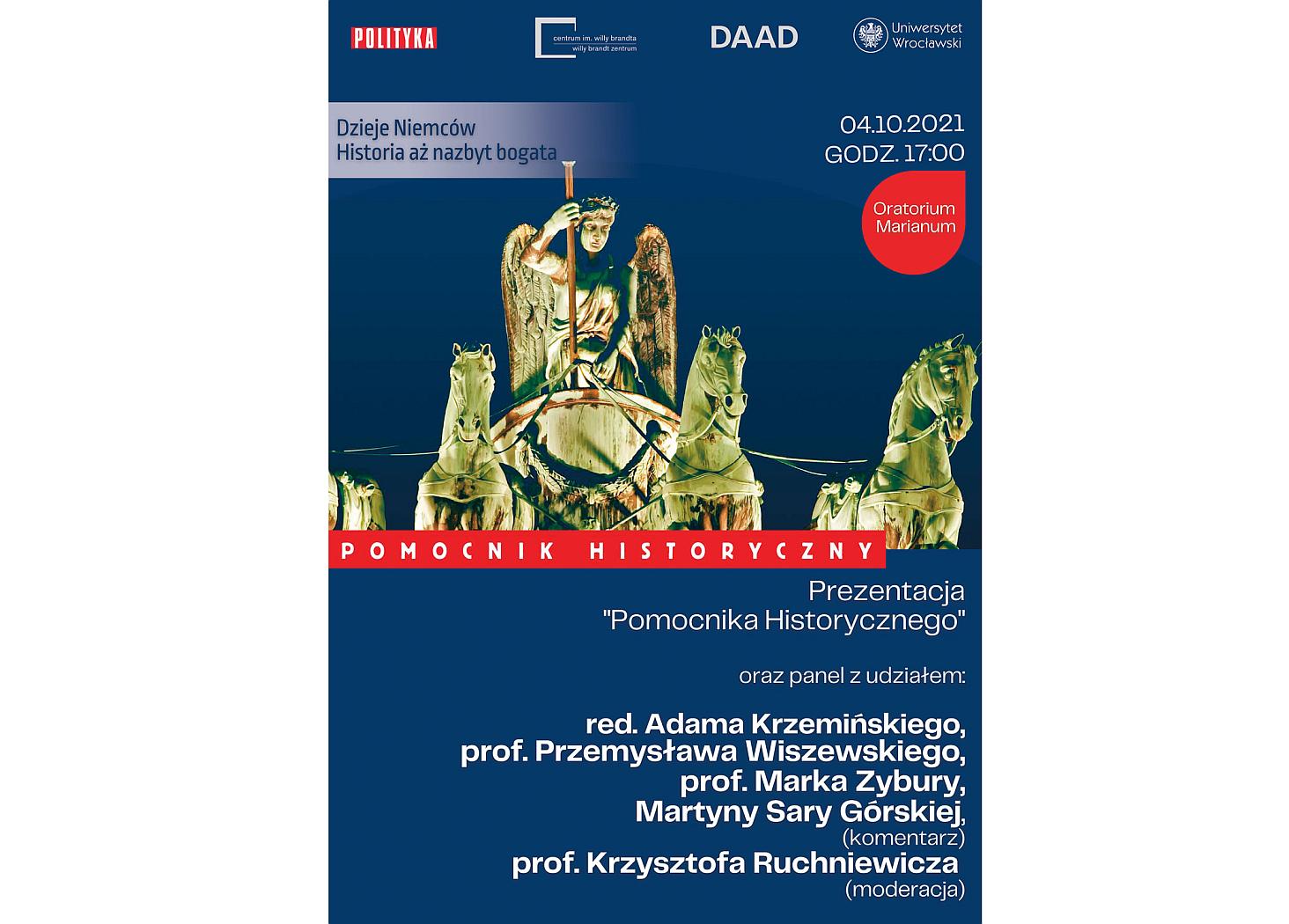 Redakcja POLITYKI oraz Centrum Studiów Niemieckich i Europejskich im. Willy’ego Brandta Uniwersytetu Wrocławskiego zapraszają na spotkanie poświęcone tematowi, którego dotyczy najnowsze wydanie naszego Pomocnika Historycznego: „Dzieje Niemców. Historia aż nazbyt bogata”. Panel moderować będzie prof. Krzysztof Ruchniewicz, a udział w nim wezmą: prof. Przemysław Wiszewski, prof. Marek Zybura i Martyna Sara Górska oraz publicysta POLITYKI Adam Krzemiński. Spotkanie odbędzie się w poniedziałek, 4 października o godz. 17 w Oratorium Marianum na Uniwersytecie Wrocławskim (plac Uniwersytecki 1, Wrocław). Wstęp wolny.